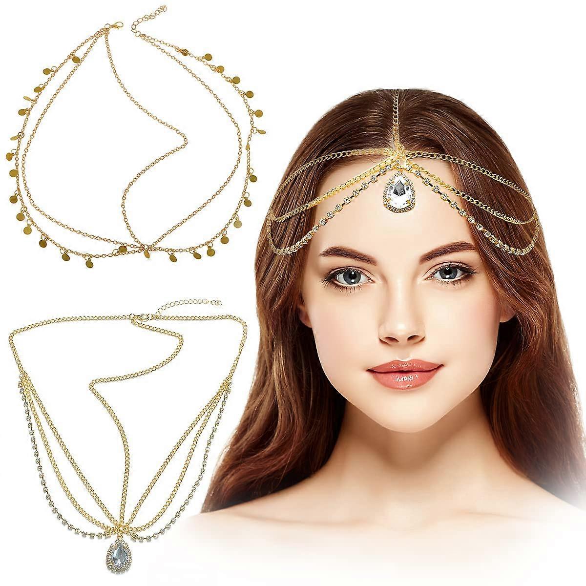Bohemian Head Chain Set for Women, 2 Gold Headpieces Adjustable Boho Hair Accessories