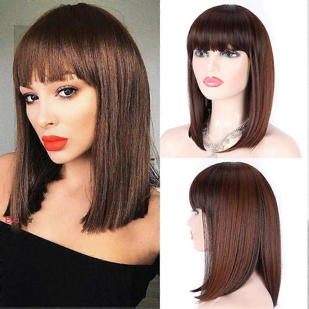 14 Inch Straight Bob Wig with Bangs for Women, Synthetic Light Brown, Natural Highlights, Adjustable Fit