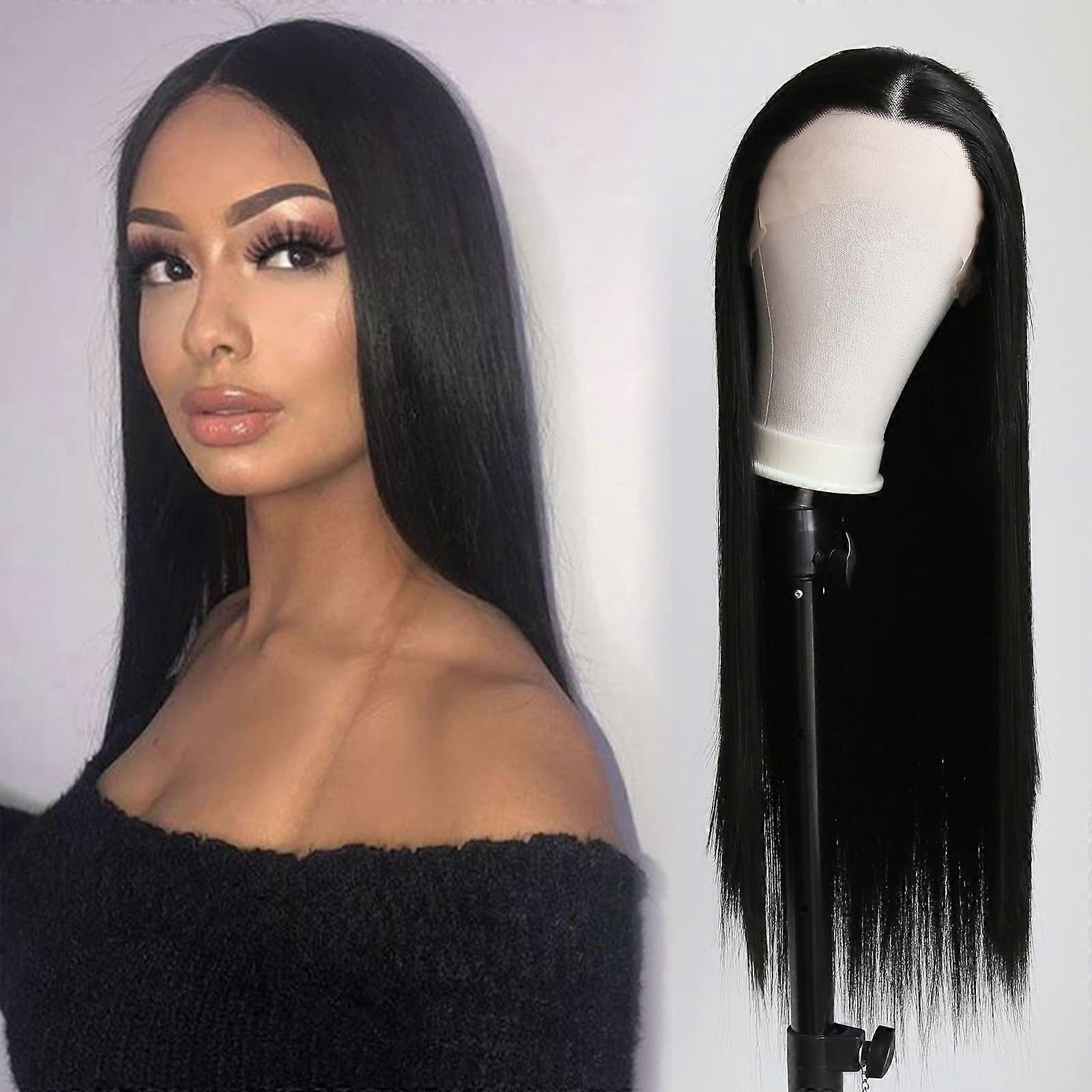 Synthetic Lace Front Wig Long Silky Straight Black Heat Resistant Natural Hairline for Women