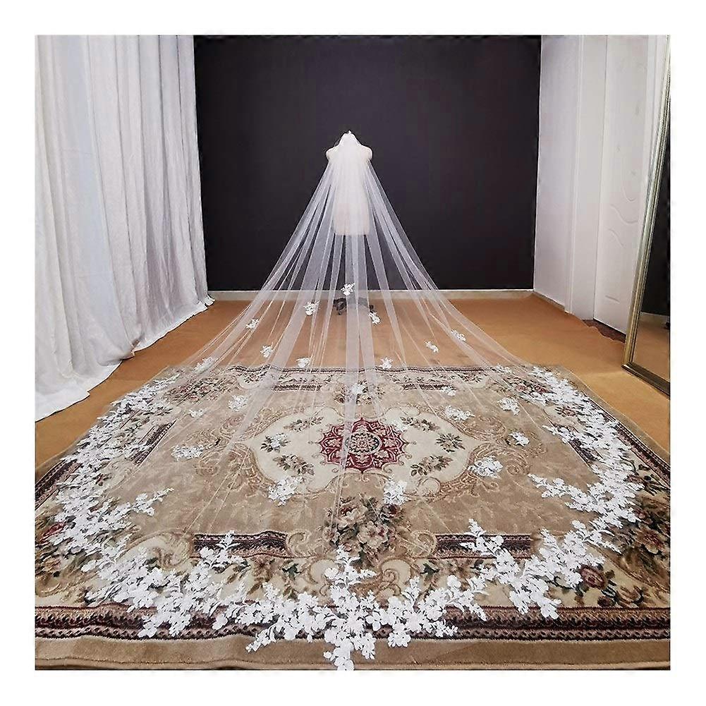 500cm White Cathedral Wedding Veil with Long Lace Appliques, Soft Elegant Tulle for Bride