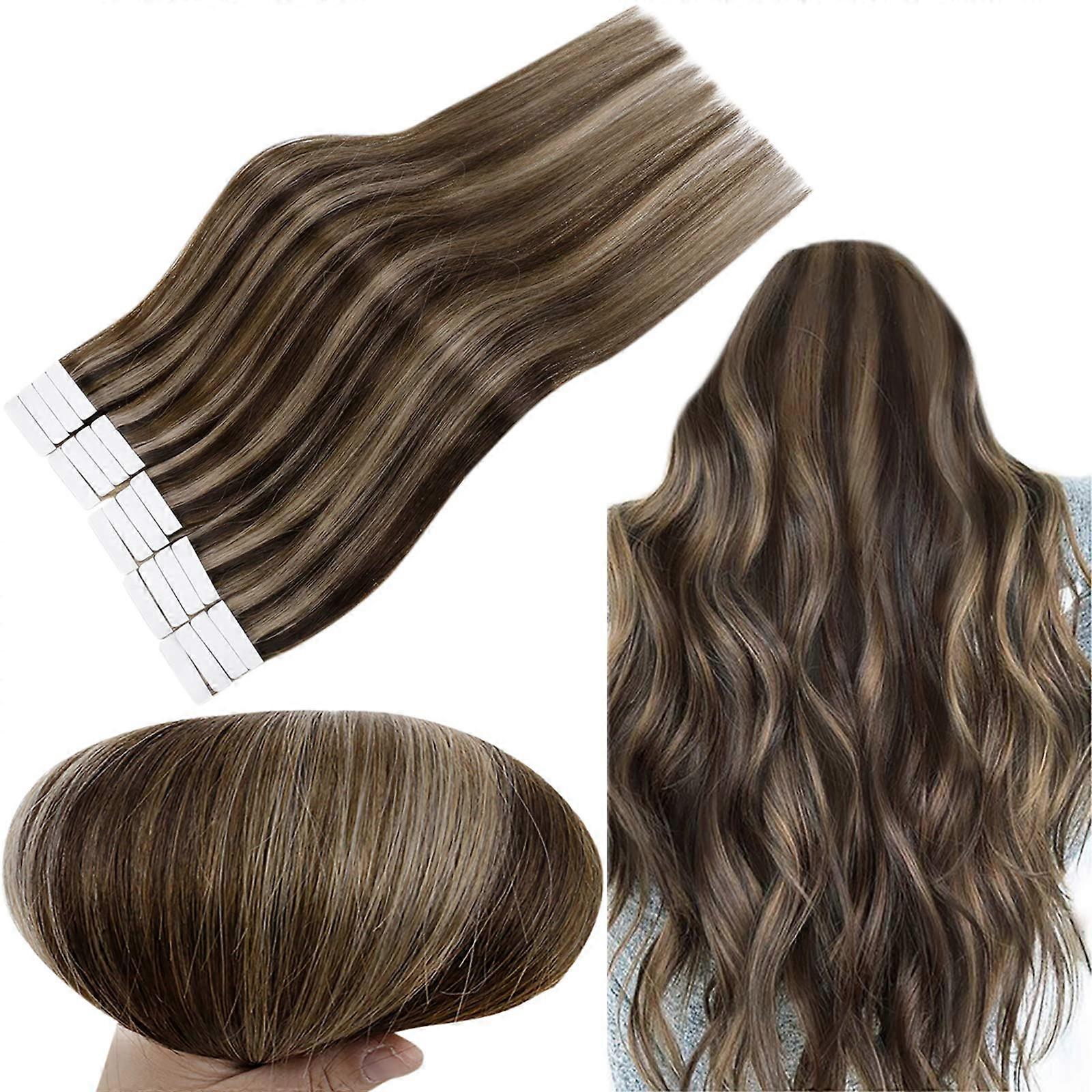20 Inch Tape in Human Hair Extensions Dark Brown Chocolate Chestnut Highlights Invisible Finish Reusable 50g 20Pcs