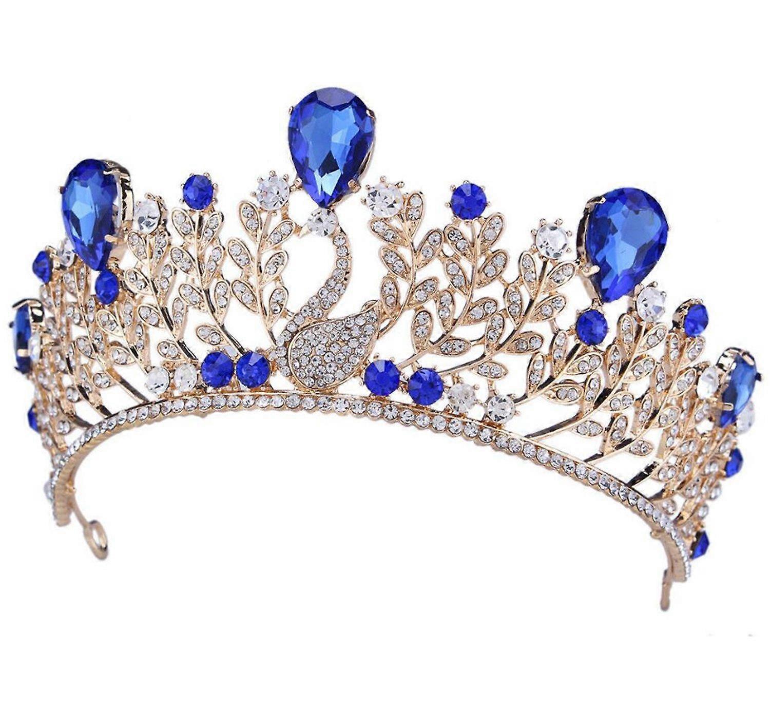Elegant Swan Bridal Crown Gold Plated Wedding Tiara with Blue Crystal Rhinestones 6.2'