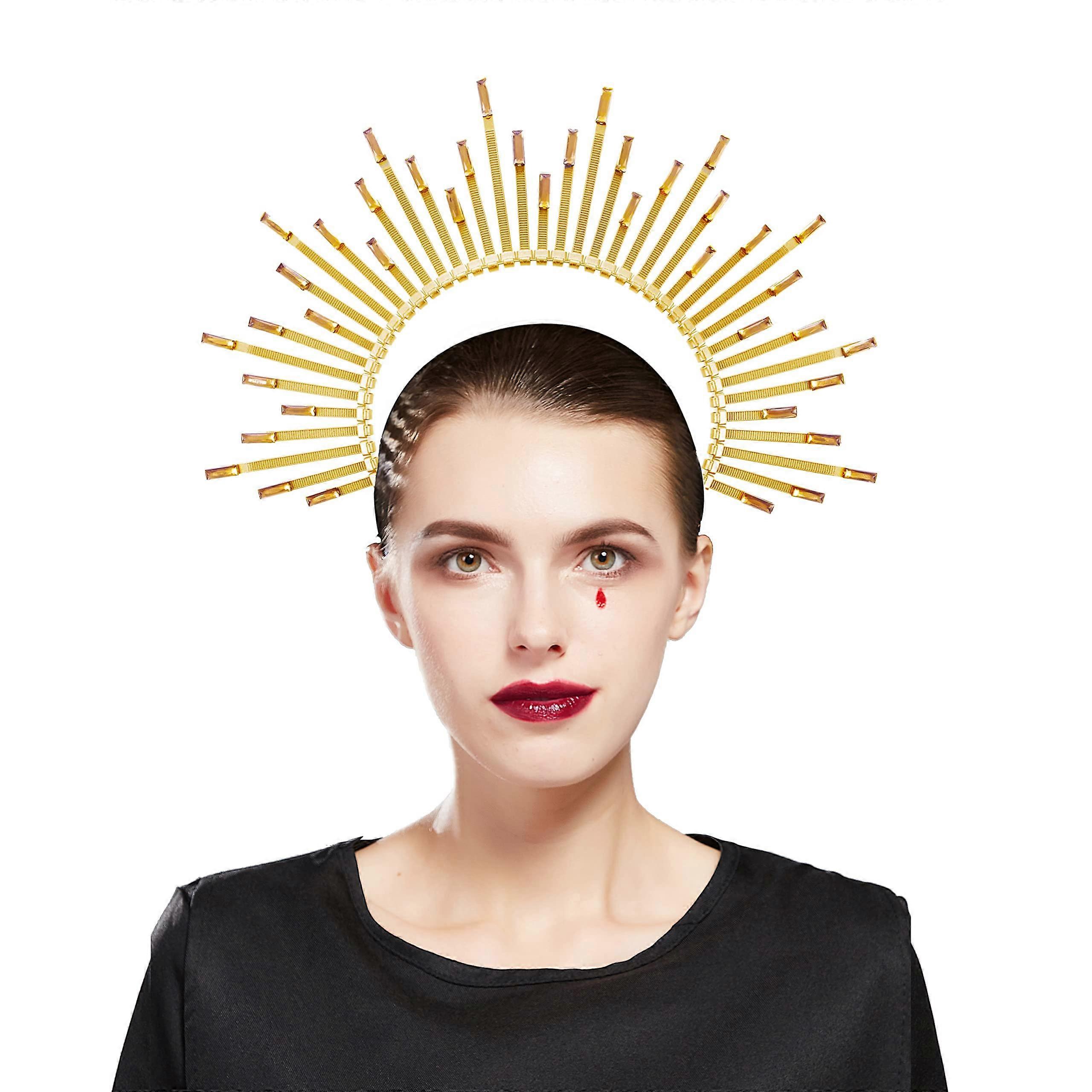 Gold Halo Crown Headband with Crystal Spiked Sunburst Design for Women Goddess Costume