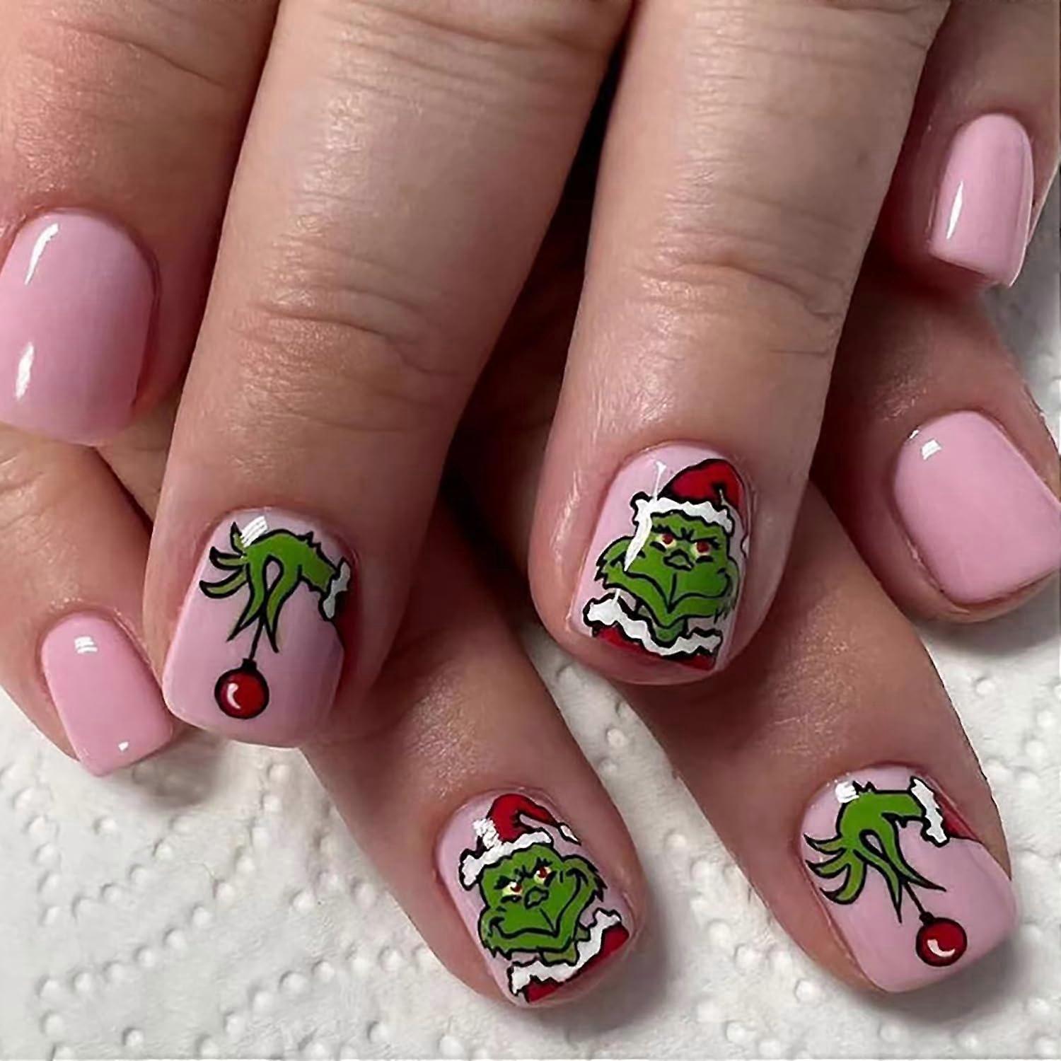 Christmas Pink Square Press On Acrylic False Nails Set, Reusable Holiday Manicure with Designs
