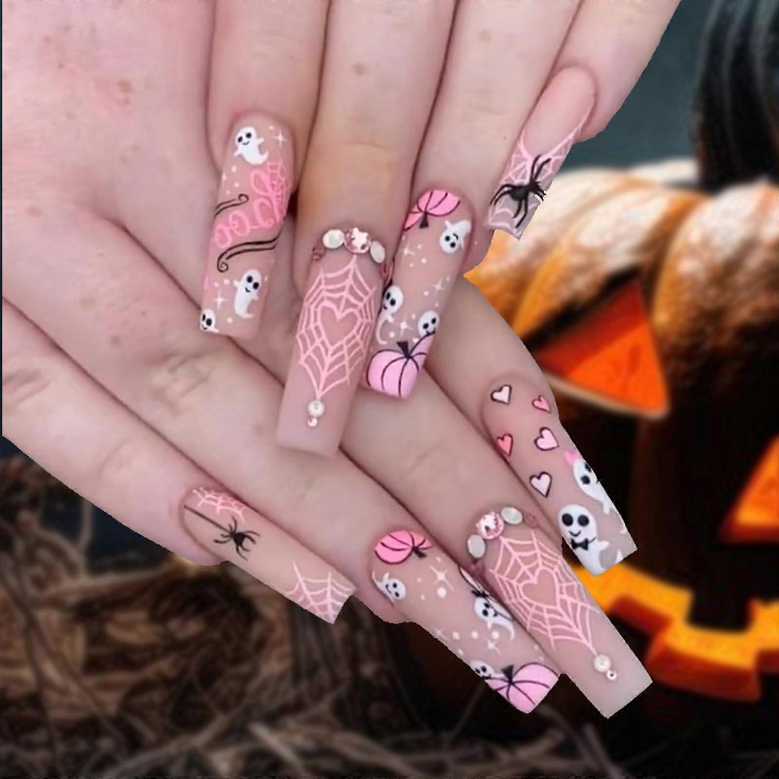 Halloween PressOn Nails designed for seasonal style and easy application Why you need it: Create a polished Halloween look in minutes without the time or tools required for salon manicures. These presson nails provide consistent, festive designs while allowing you to change your look for parties, events, or photos. Key benefits: Fast to apply, comfortable to wear, and reusable when removed carefully. Multiple sizes are included to accommodate different nail shapes and lengths. The set offers a readymade solution for themed looks without painting or long drying times. What is included 24 fake nails featuring ghost, pumpkin, spider web, and heart designs 24 pieces of jelly glue for secure attachment 1 mini nail file for size and edge adjustments 1 wooden stick for preparing or removing nail tips Material and performance Constructed from quality ABS acrylic material for a lightweight, smooth finish Durable and resistant to cracking under normal wear Low odor material with a refined surface that accepts glue evenly Size and compatibility 24 nails provided in varied sizes to fit most natural nails Suitable for short to medium nail lengths and a range of nail widths Can be trimmed or filed for a custom fit using the included mini file Easy application in three steps Prepare: Trim and clean natural nails, push back cuticles with the wooden stick if needed Apply: Select the matching size, apply a small amount of jelly glue to either the natural nail or the false nail Press: Position the false nail and press firmly for about 20 seconds to secure Removal and care Gently lift edges with the wooden stick after soaking or using an appropriate remover; avoid forceful prying File or buff edges before reapplying if you plan to reuse nails Store nails flat in the original packaging to preserve shape and design Use scenarios Halloween party or costume event: Complete a themed costume with coordinating nails for a polished look Quick photo shoot or social media content: Apply festive nails for seasonal photos without a lengthy salon visit Lastminute outfit enhancement: Add instant style for parties, gatherings, or trickor outings What makes this set stand out Readytowear festive designs that save time and effort Complete kit with glue and basic tools for immediate use Multiple sizes and a durable material that withstands regular wear This nail set provides a practical, easy way to achieve a Halloweenready manicure at home or on the go.