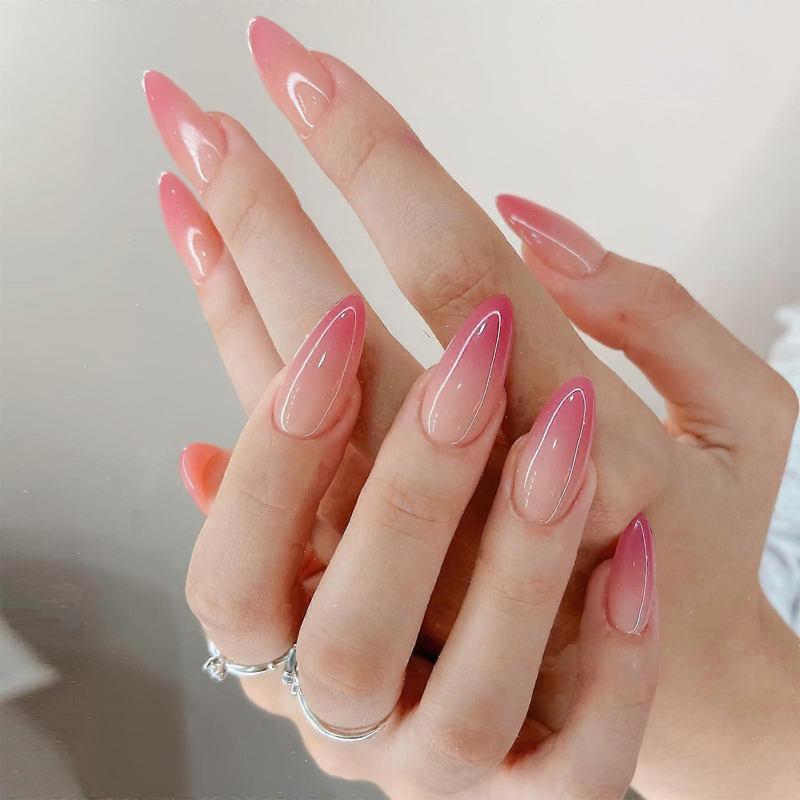 Gradient Pink Press on Nails 24pcs Medium Almond Nude Fake Nails Glossy Reusable Salon Quality