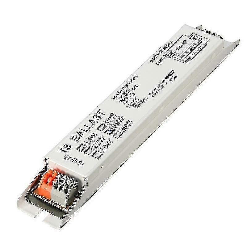 Wide voltage T8 electronic lamp ballast for fluorescent lights, compatible with 2x18W, 2x30W, 2x36W, and 2x58W setups. Features optimized circuit matching design for high performance, long life, energy saving, no stroboscopic effect, and no noise. Made from high-quality raw materials, suitable for various lighting applications. Package includes 1 piece, product number SM16783.