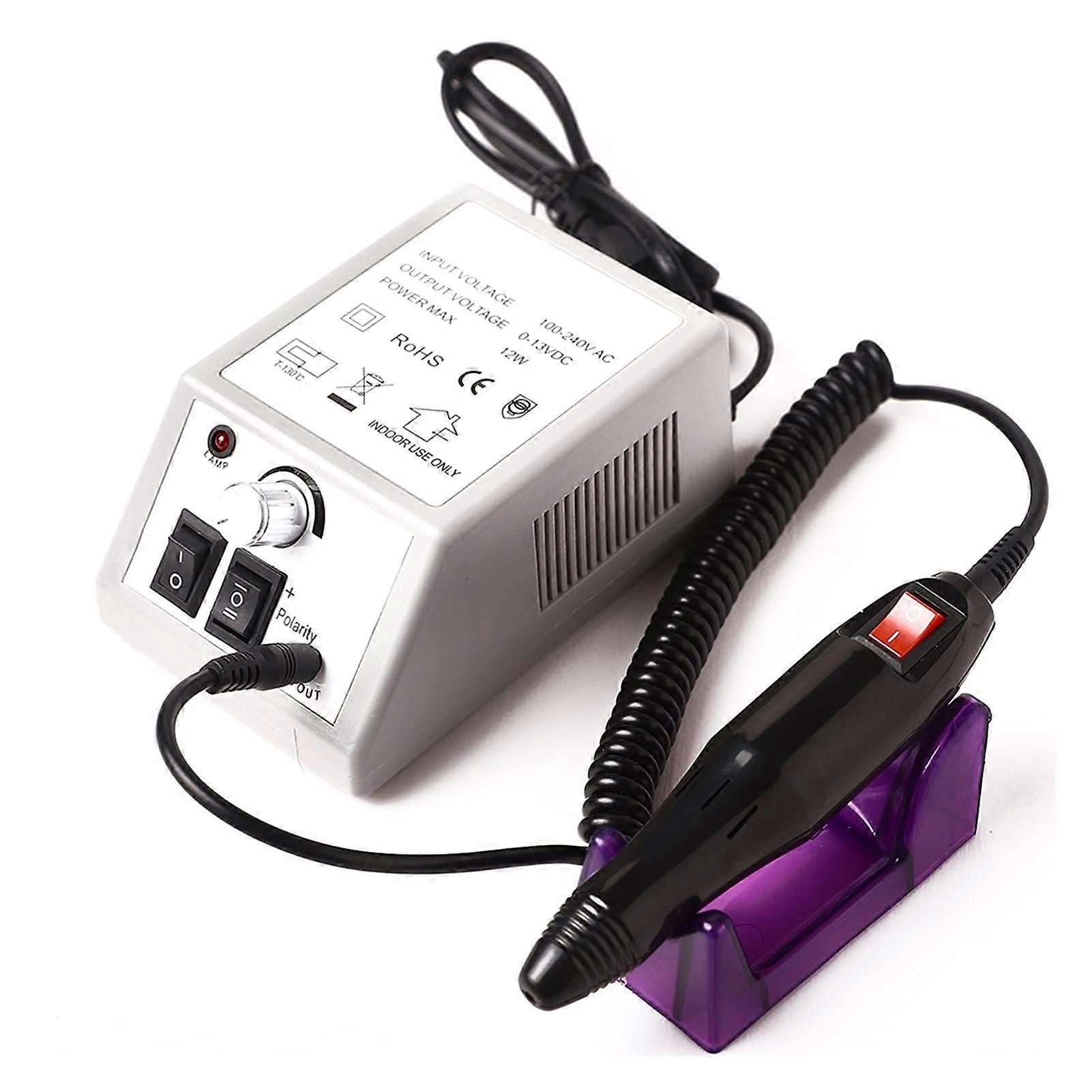 Professional Nail Drill for Manicure and Pedicure A precise, torque nail drill designed for salon professionals and home users. The powerful motor delivers consistent performance up to 20,000 RPM to prevent stalling under normal pressure, making it suitable for polishing, shaping, removing gel and acrylic, and smoothing calluses on hands and feet. Key benefits Reliable power and torque that maintain steady operation during filing and polishing tasks. Versatile for a wide range of nail work including gel removal, acrylic and poly gel shaping, and callus smoothing. Compact, lightweight design and low vibration for comfortable, extended use. Main features Speed range 0 to 20,000 RPM for precise control from gentle finishing to faster material removal. 12W motor provides strong, stable performance without frequent interruptions. Forward and backward rotation lets you choose the direction that suits your technique. Manual on/off switch for simple, reliable control. Ventilated housing and intelligent heat dissipation reduce operating temperature. Low noise and low vibration for a more comfortable working experience. Multipurpose use: carving, engraving, routing, grinding, sanding, and polishing. aluminum alloy handpiece for balanced, stable handling; main body constructed from ABS plastic. Portable size and soft vibration for an easier grip and convenient transport. Specifications Item type: Nail Drill Power: 12W Speed: 0 to 20,000 RPM Materials: ABS plastic body, aluminum alloy handpiece Available colors: Grey, Black, Pink, White, Purple Size: 24 x 13.5 x 7 cm Weight: 565 g Compatibility and common applications Safe for use on acrylic nails, poly gel nails, dipping powder, false nails, and natural nails. Effective for removing or polishing nail gel and for smoothing thick nails and dead cuticles. Also suitable for light callus work on hands and feet and for detailed nail art carving or engraving. What is included Main machine x 1 Handpiece x 1 Set of 6 base nail drill bits x 1 Handpiece holder x 1 Manual x 1 Box x 1 Use scenarios Salon manicure and pedicure: Use the adjustable speed and forward backward rotation to shape and finish acrylic or poly gel enhancements with consistent torque. At home gel removal: Remove or polish gel nails and refine the nail surface safely using the low vibration handpiece and controlled speeds. Nail art and maintenance: Carving, engraving, and polishing details on nail tips or smoothing calluses and thickened skin on hands and feet. This multifunctional nail drill combines precision, power, and portability for professional results in both salon and home settings.