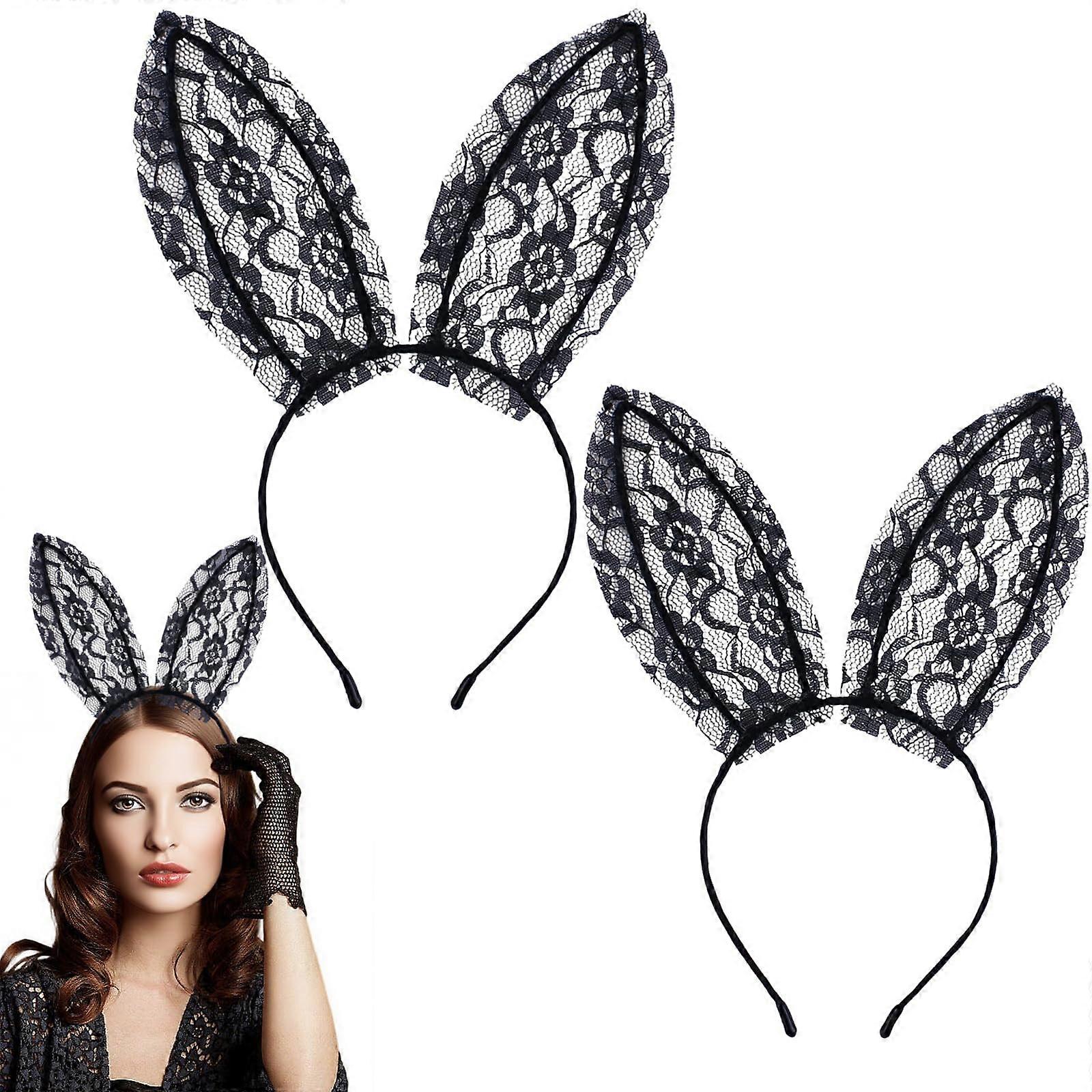 Black Lace Bunny Ears Headband Set, Adjustable Rabbit Ear Hair Hoop for Halloween Cosplay Parties