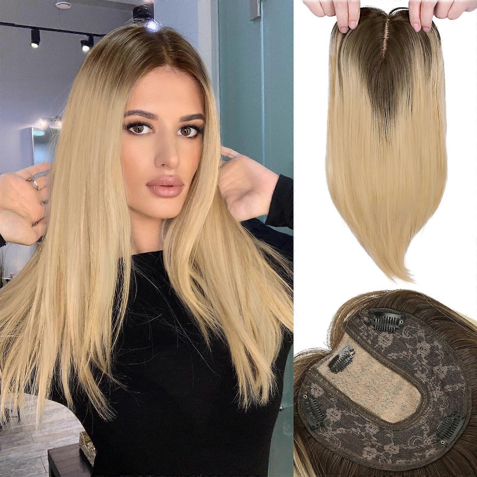 Hair Topper for Women 14 Inch Straight Synthetic Blonde with Dark Roots Clip In for Thinning Hair