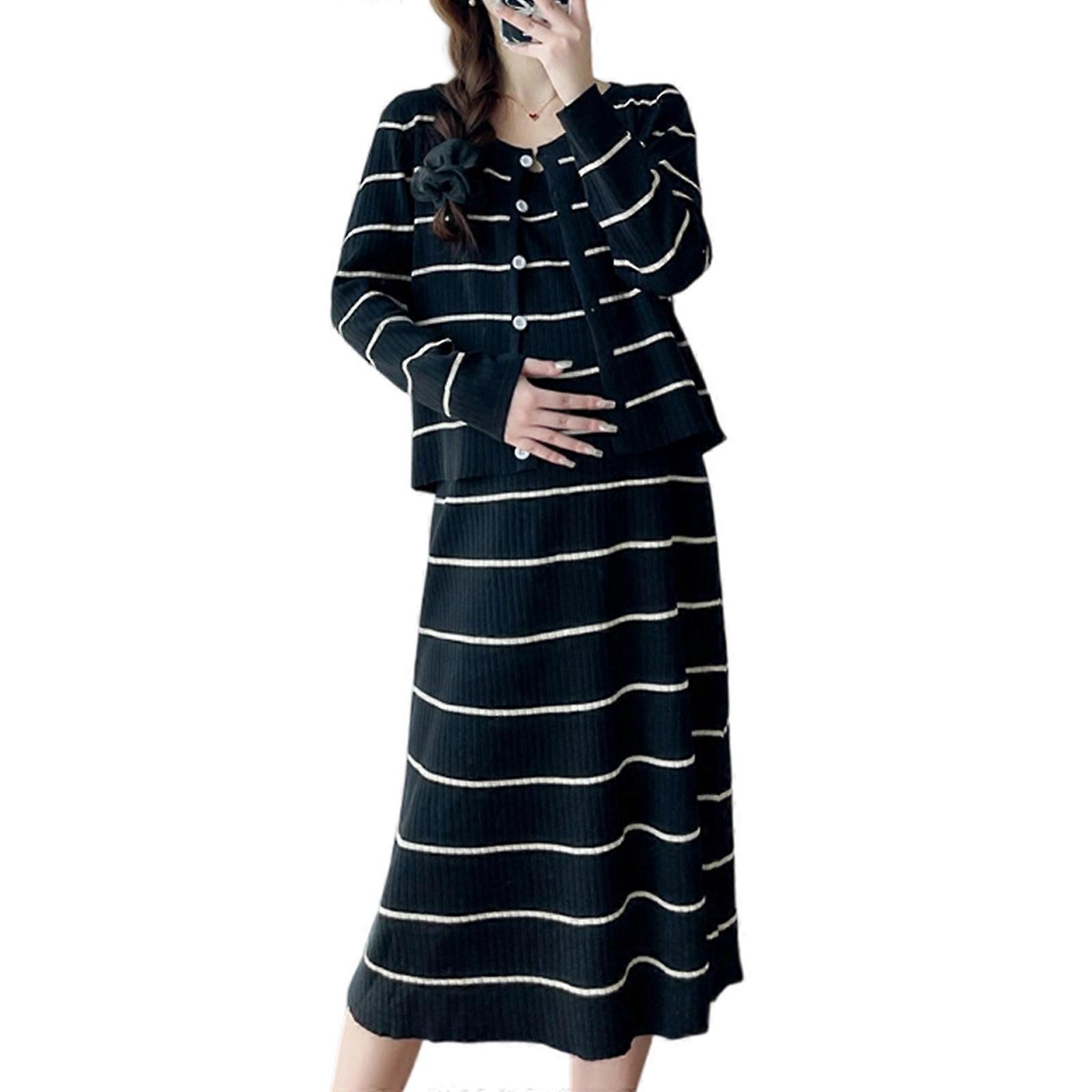 Knitted Cardigans with Long Dress Maternity Button Down Cardigan and Dress Set Breathable Pregnant Women Clothes Outfit Black XL