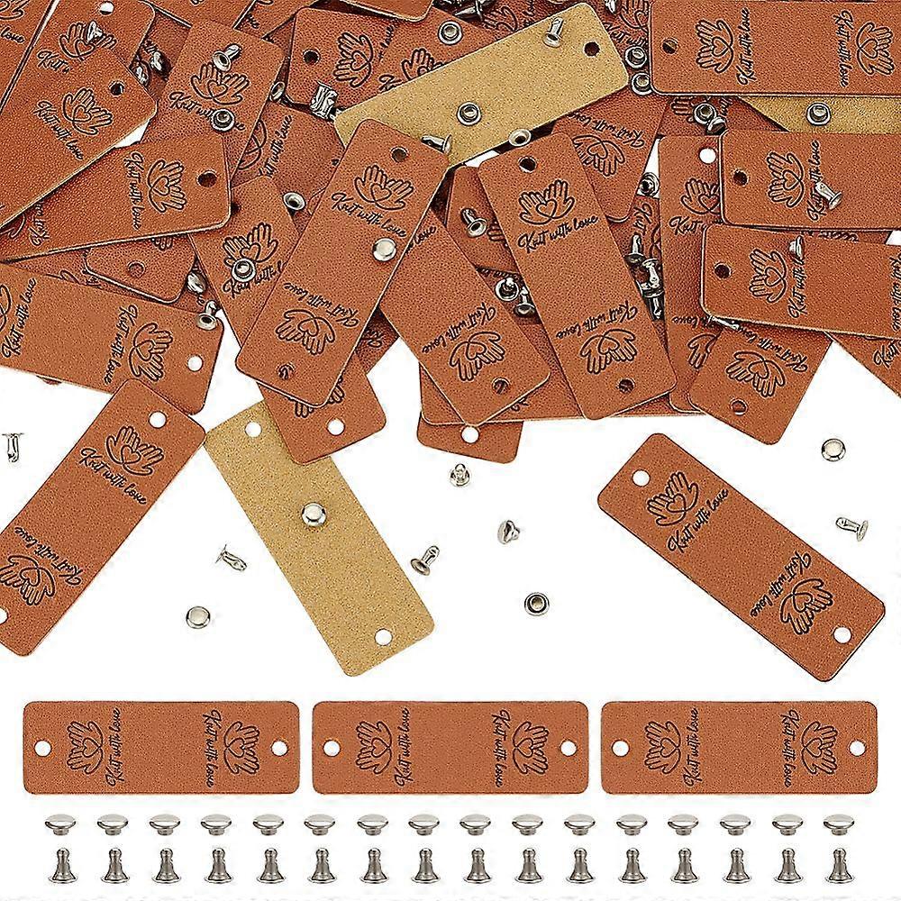 48 Sets PU Leather Label 2.2x0.8inch Hand Pattern Handmade Leather Labels for Crochet Items Chocolate Color Rectangle Embossed Crochet Tags with Rivet