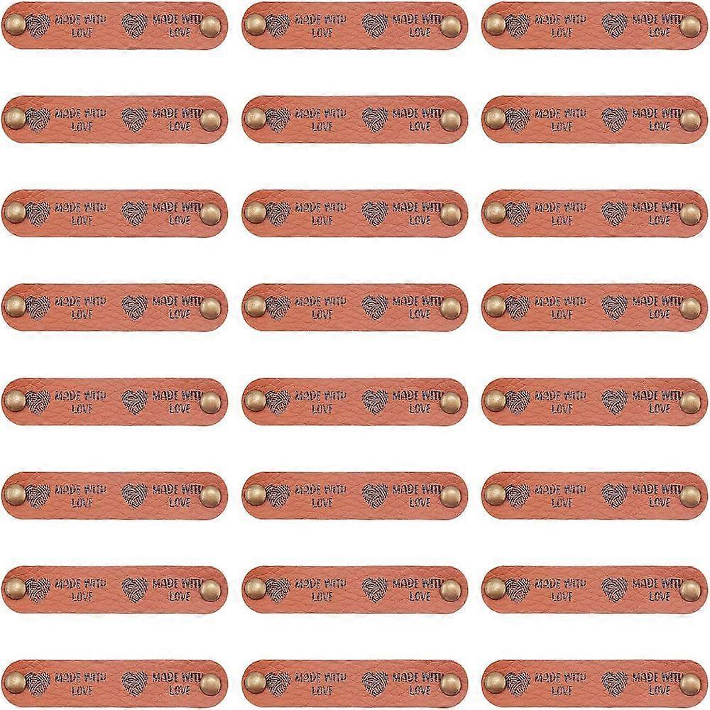 24 Sets Hand Made Embossed Tag PU Leather Label with Heart Pattern 2 Rivet 0.5x2.6 inch Brown Leather Tags Button Oval Made with Love Tags for Jeans B