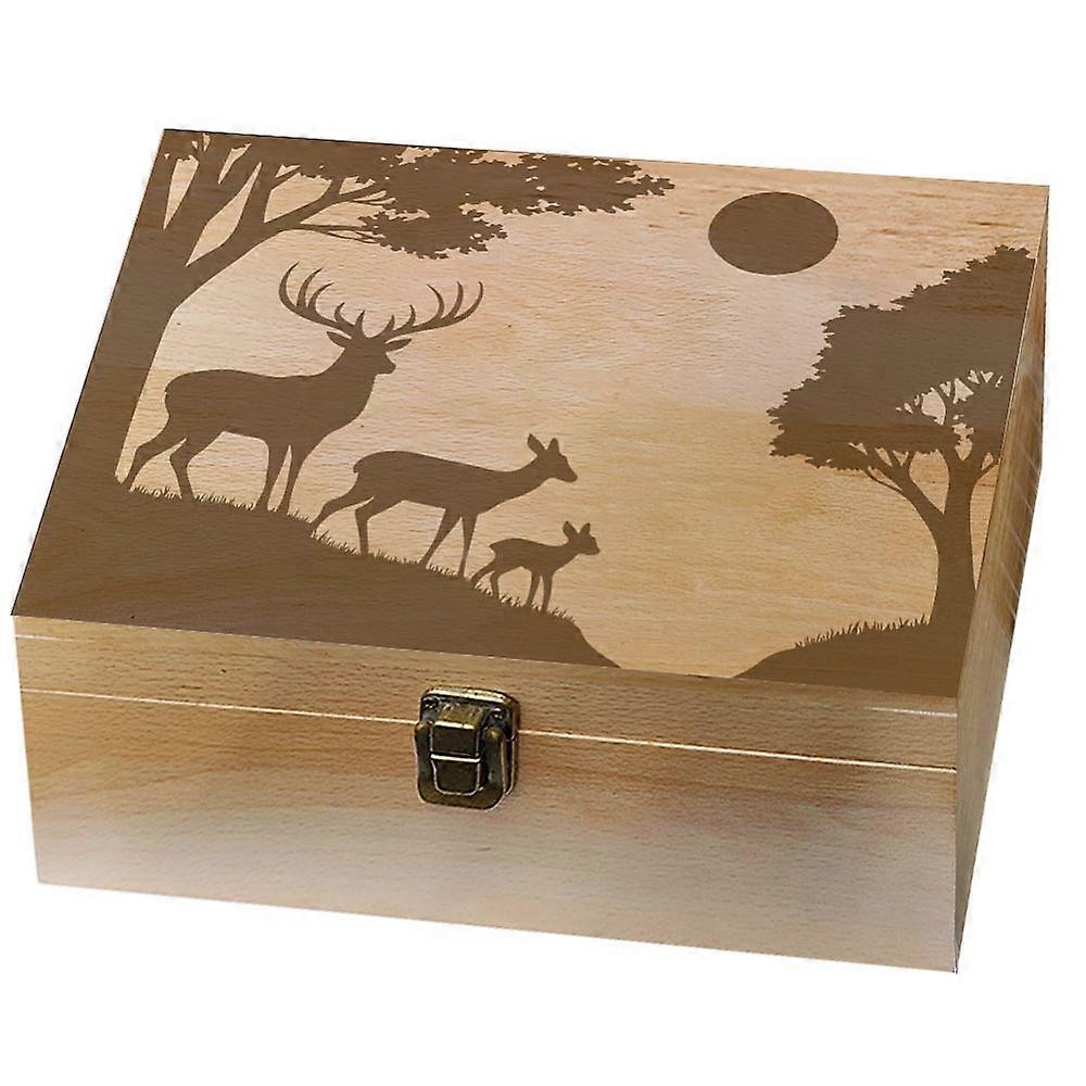 1 Pc Wooden Memory Keepsake Box, A Family of Three Deer in The Forest with The Sun Storage Decorative Memory Wooden Box with Hinge Lids for Photos DVD