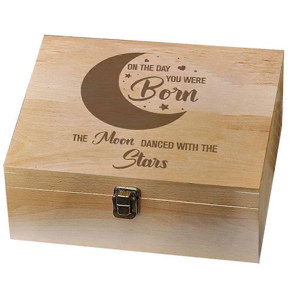 Suitable Size -- Its whole dimensions are 9.6 inch(24.5cm) long, 7.6 inch(19.5cm) wide, and 4 inch(10.3cm) tall, inside dimensions are 9 inch(23cm) long, 7 inch(18cm) wide, and 2.7 inch(7cm) tall, easy to place on home, office, etc, making space on desks, countertops, bookshelves, vanity and more Well Made -- The durable box for keepsakes features with wood, expertly crafted with a matte finish, polished well, no worry scratches, and won't snag clothing or give you splinters, built to last Delicate Appearance -- Our memory box is designed with moon pattern and "on the day you were born,the moon danced with the stars" lettering, painted clearly to see the fine details, raw wood color brings more texture for it, quite delicate and ideal for you to store items. You can also use it as a gift for anniversaries, weddings, memories, birthdays, Valentine's Day, etc Private and Safe -- It is designed with metal locking clasps to secure the lid, allowing for easy opening and closing of the box, keep things private and safe, if the boxes is difficult to be opened and closed. Tip: Please don't place the wood box in wet room Memory Box -- Wood keepsake box with exquisite pattern is as memorable as the treasured memories it's designed to protect, keeping any your cherish memory in this boxes, ideal for tourist souvenirs, group photos, collectibles, or special mail, letters, photos, gifts, etc