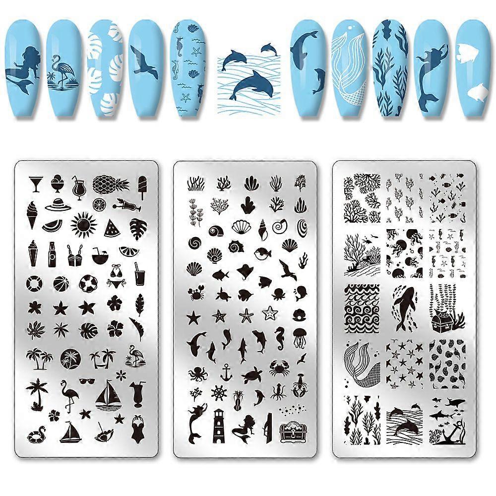 3pcs Summer Ocean Nail Stamping Plate, Marine Animals Art Templates Ocean Sea Beach Nail Art Stencils Stainless Steel Image Plates for Women Print Man