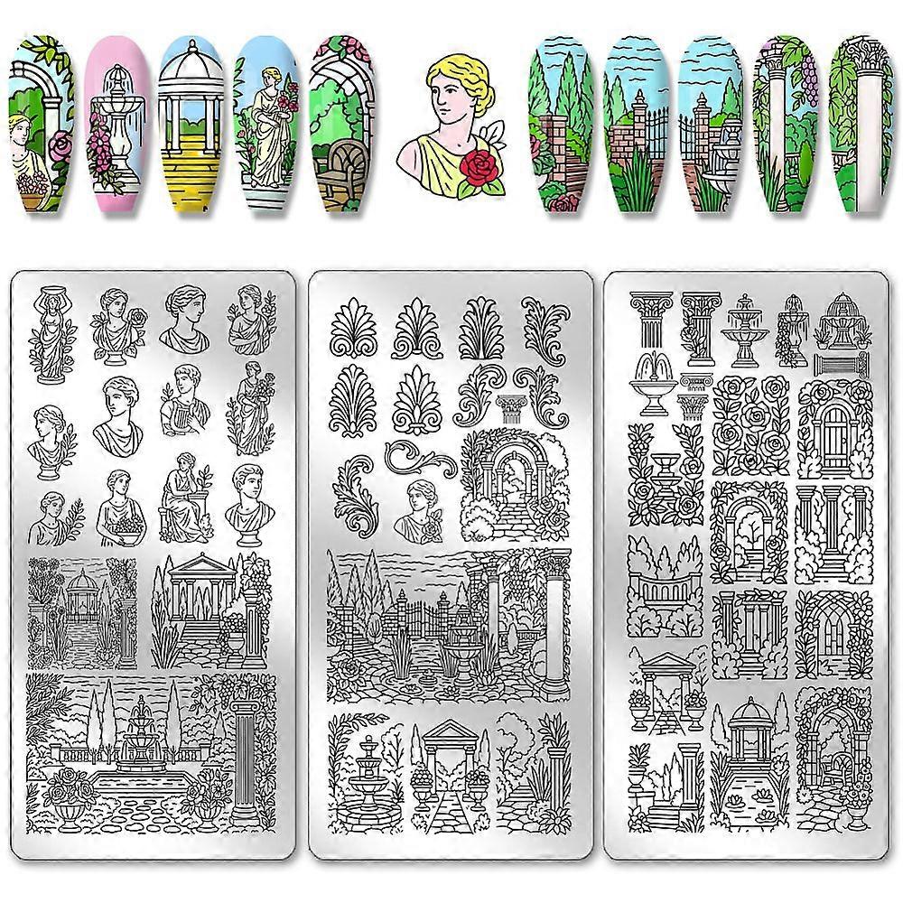 3pcs European Style Garden Nail Stamping Plates Sculptures Patterns Nails Art Stencils Fountains Nails Image Plates Flower Plants Nail Art Templates f