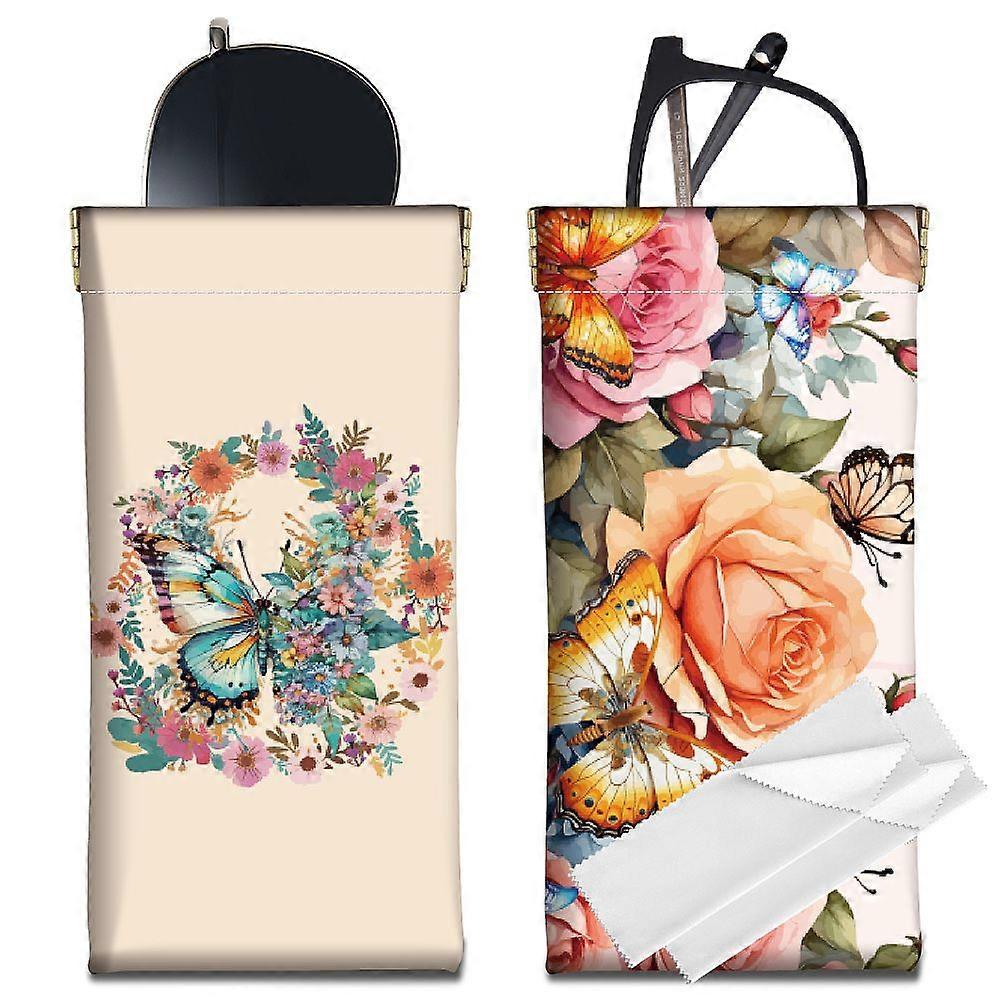 2 Pcs Glasses Case Soft Sunglasses Case Portable Squeeze Top PU Leather Eyeglass Pouch Flower Butterfly Eyeglasses Holder Pouch with Cleaning Cloth fo