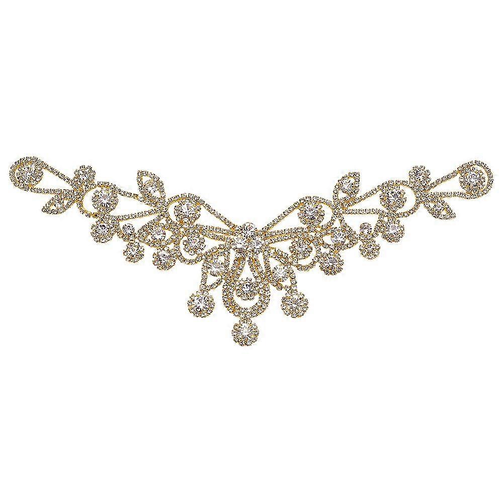 V-Neck Neckline Applique Patches 9x4.9inch Sew on Long Golden Back Glass Rhinestone Patches Decorative Wedding Bridal Collar Decoration for DIY Crafts