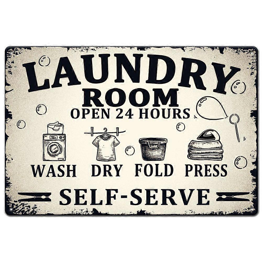 Laundry Room Tin Signs Retro Metal Poster Open 24 Hours Plaque Vintage Decort Self-Serve Laundry Sign Decorative for Home Cleaning Room Apartment Scho