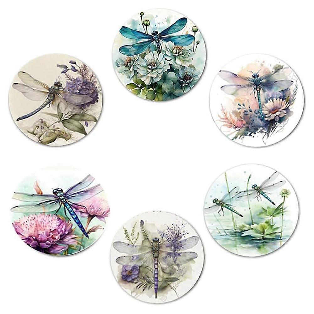 6PCS Dragonfly Floral Coasters 4 Inch Round Absorbent Wooden Cup Holders with Cork Base Tabletop Protection Coffee Mugs Wood Mats Coasters Saucers Pad