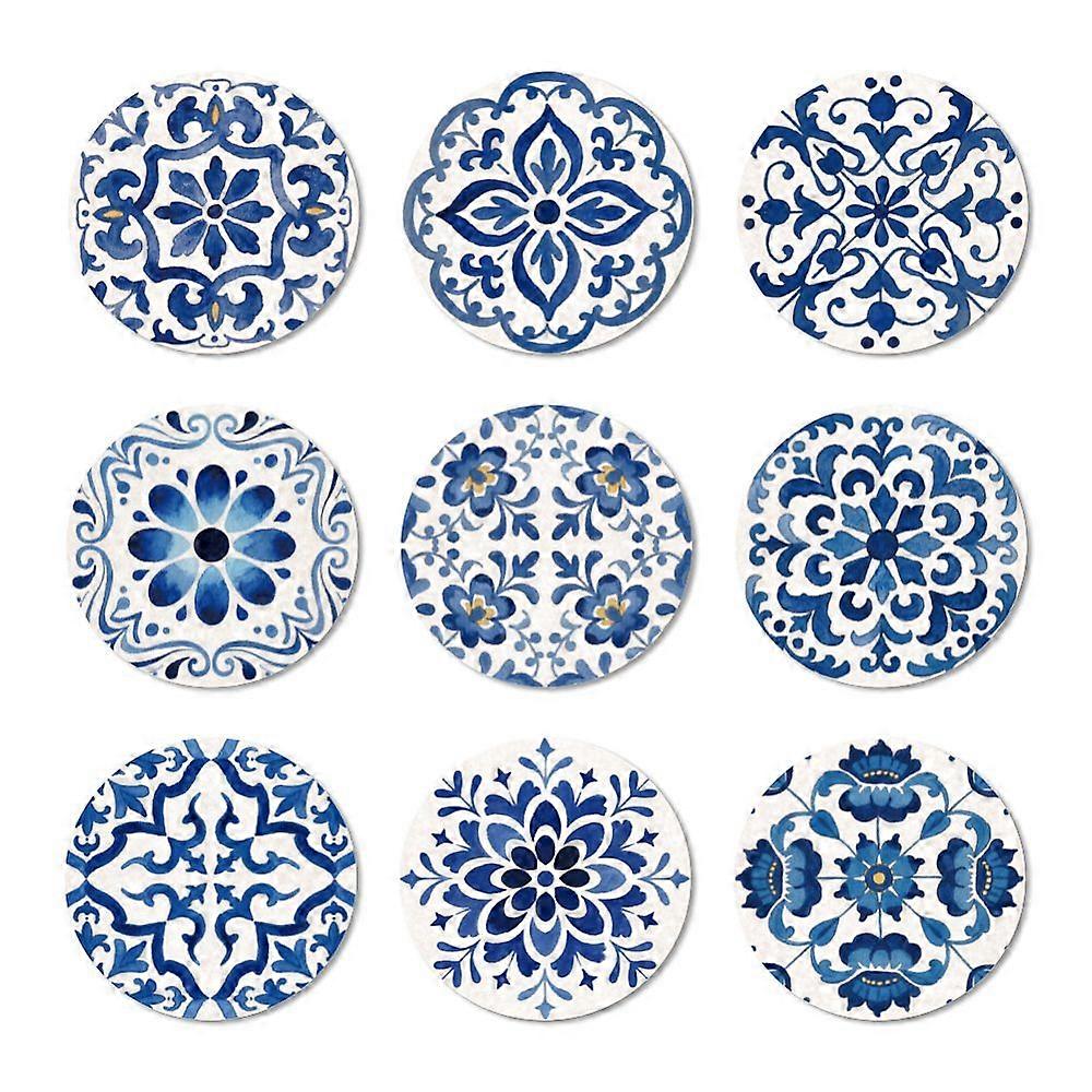 9 Pcs Wood Coasters for Drinks Blue Spanish Pattern Colorful Wooden Cup Mat for Coffee Table Decor, 3.9" Non-Slip Desk Coasters for Home, Apartment, O