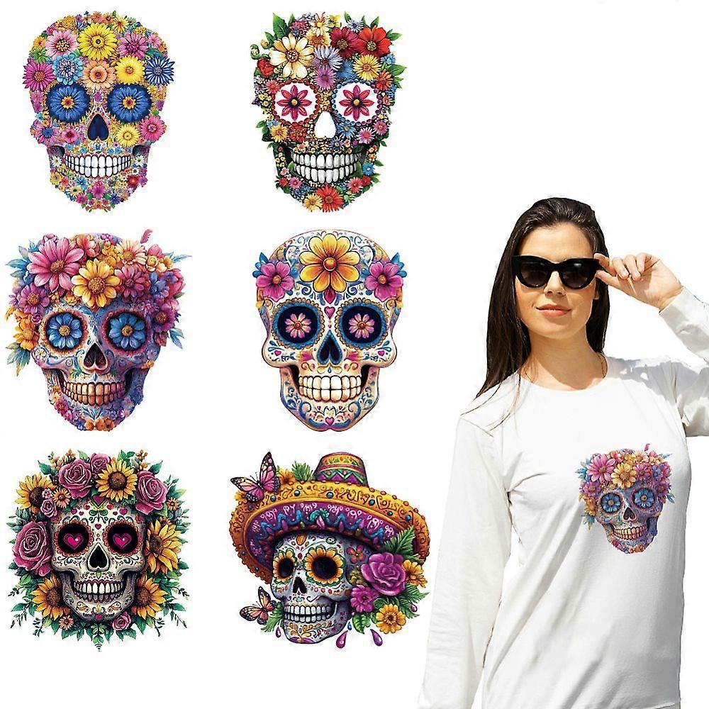 6 Sheets Day of The Dead Cloth Iron on Stickers, Sugar Heat Transfer Stickers Decals for DIY T-Shirt Jeans Backpacks Families Clothing Hat Decoration