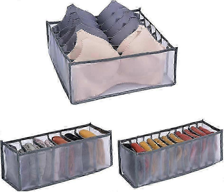 [Package]: the set includes 3 kinds of closet storage boxes, which are very suitable for all daily underwear, and the set can be washed without odor [Fabric high quality]: the underwear drawer organizer set is made of high quality mesh fabric, thickened, fine workmanship, neatly routed, fine mesh, strong and durable [Space Saver] : drawer dividers are great for saving space for your closet, drawer, cabinet and cupboard, they massively improve the utilization of your drawer space, you can also be easier to find the one you want, makes you save a lot of time when picking up your items [Product solution]: put it in a closet or drawer, store underwear, appropriately sized socks, a compartment can store an item , separate storage and classification, and store separately without deformation [Organizer Size]: 6 lattice bra box: 32 x 32 x 12cm (each grid: 32 x 5 x 12cm) 7 lattice panty box: 12 x 32 x 12cm ( each grid: 12 x 4.5 x 12cm) Box of 11 bra socks: 12 x 32 x 12cm (each grid: 12 x 2.5 x 12cm), three kinds of design to meet all your storage needs, good for organizing your bra, socks, underwear, ties, etc.