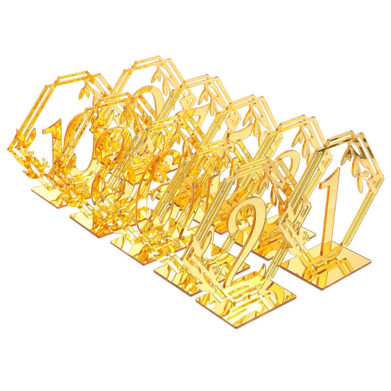 These table signs are widely applicable, such as wedding ceremonies, conference, party, restaurant, birthday, engagement, wedding banquet, cafes, bars and other catering enterprises, as well as other occasions where you need to hold organization activities. Features - Color: Golden - Material:Acrylic - Size: About 11.80X10.00X4.00cm/4.64X3.93X1.57in - Table numbers sign is made of safe acrylic material, excellent and , and will not break easily. - Using simple shape design, beautiful and interesting shape, can attract the attention of guests. - Our acrylic place cards come in nice shape, attractive and fun, which can arouse guest's attention - The seating sign has excellent practicality and can help you distinguish the seats of your guests. - Great for restaurants, banquets, reception rooms, and party supplies for large events and meetings. Package list: 10 x table signs