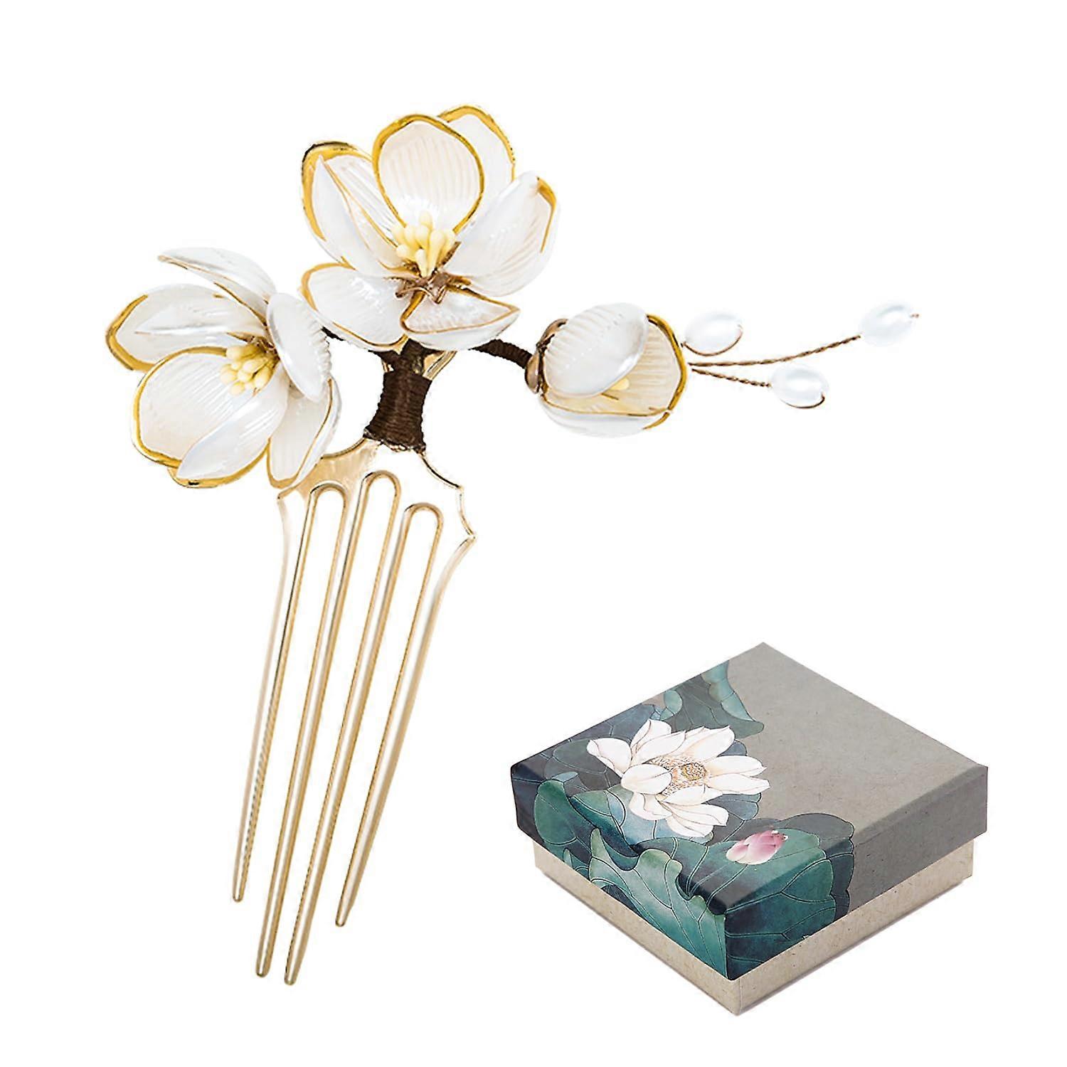 Lotus Flower Hairpin with Imitation Pearls Key features materials: constructed from alloy and plastic for a decorative yet durable piece. Secure fork design: twoprong fork holds hair in place for stable styling throughout the day. Handmade detail: each hairpin is carefully crafted by skilled artisans, giving each piece a unique finish. Elegant accents: imitation pearls and lotus flower design add a refined touch to formal and casual hairstyles. Ready to gift: includes one hairpin packaged in a nice gift box. Size and fit Dimensions: about 3.9 x 4.7 inches (10 x 12 cm). Measurement tolerance: 0.1 to 0.5 cm deviation due to manual measurement. Color note: actual color may vary slightly from images because of monitor differences. Why choose this hairpin Keeps hair neat: the forkstyle pin secures buns, twists, and halfup styles without bulky clips. Versatile styling: works with a variety of hair types and thicknesses, suitable for everyday use and special occasions. Decorative and practical: combines ornamental detail with functional stability. Suggested uses Wedding and formal events: complements bridal or bridesmaid updos and elegant evening looks. Holidays and celebrations: adds a polished accent to party hairstyles and traditional outfits. Daily wear and office use: elevates simple styles while keeping hair tidy during the day. Package contents 1 PCS Lotus Flower Hairpin in gift box. Care and service Handle gently to preserve pearls and decorative elements. Avoid prolonged exposure to water or harsh chemicals. If you encounter any problem with the item, please contact us and we will respond promptly to assist.
