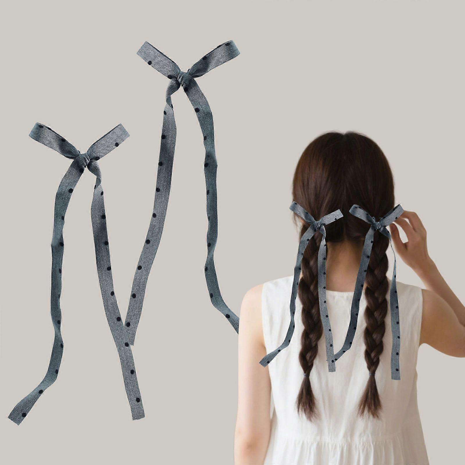 Denim Hair Bow Clips with Long Tails 2 Pack Gray Polka Dot Claw Clips for Women Secure Grip