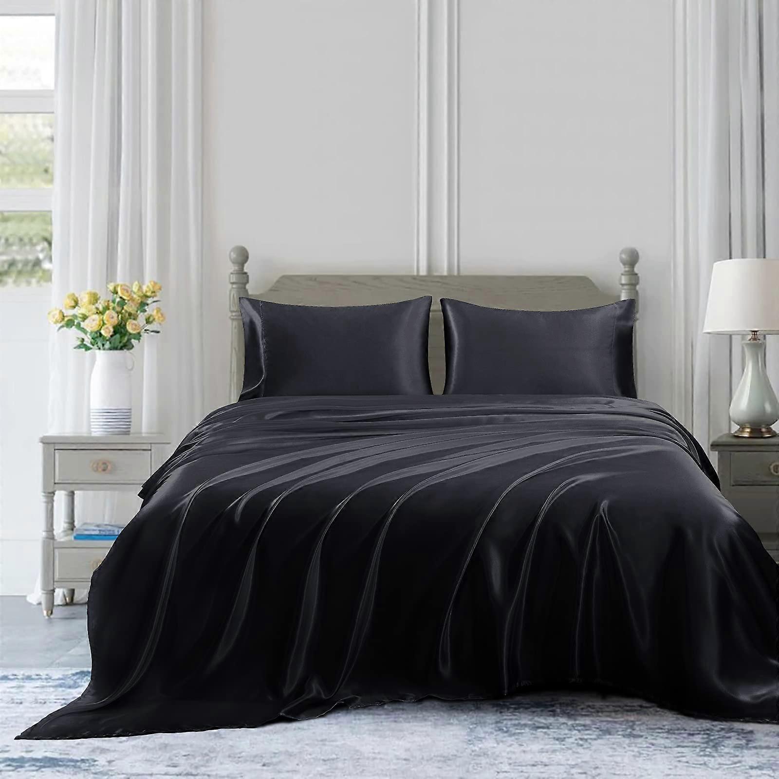Full Size Black Satin Bed Sheets 4 Piece Set, Silky Satin Surface with Extra Deep Pocket Luxury Style
