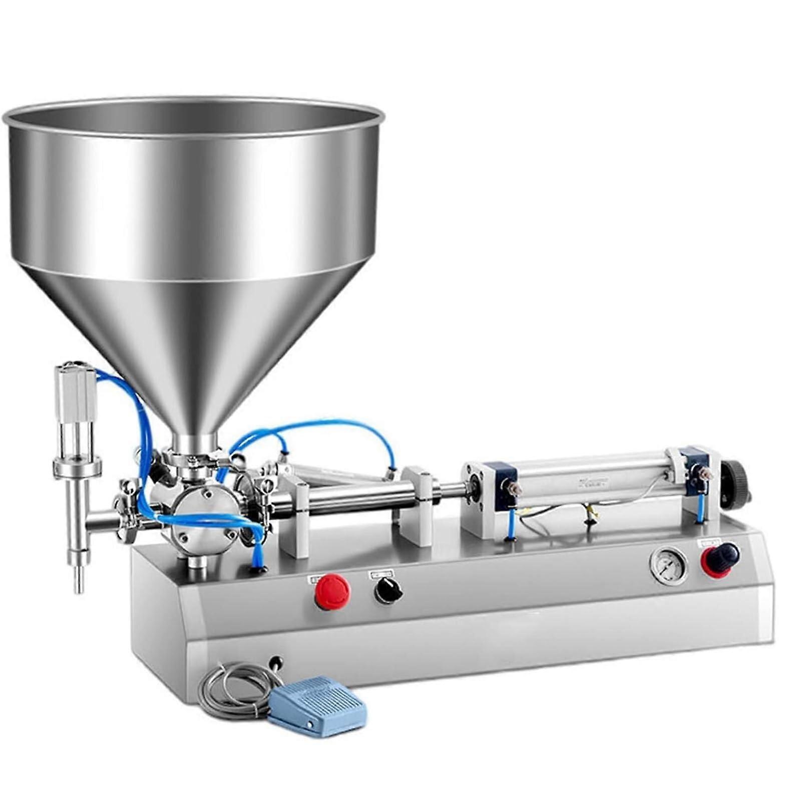 Pneumatic Paste Bottle Filling Machine Capacity: 20 to 200 ml Product overview A compact pneumatic filling machine designed for stable, accurate filling of liquids and pastes in volumes from 20 to 200 ml. All parts that contact product are made of 304 stainless steel for corrosion resistance and long service life. The body is stainless steel for strength and easy maintenance. cylinder and oil water separators support precise dosing and consistent product purity. Key benefits Accurate, repeatable filling: pneumatic drive and precision anti drip valve produce consistent dose control for each container. Durable materials: 304 stainless steel contact parts resist corrosion, rust, and acid or alkali exposure for extended use. Easy adjustment: magnetic switch plus a knob and a remote control handle allow quick, tool setting of filling volume. Simple operation: manual handle for direct control and an automatic detection system for conveyor fed bottles reduce training and operating time. Hygienic and serviceable: removable conical hopper is easy to disassemble and clean, simplifying product changeovers. Stable and safe setup: heavy metal iron base minimizes tipping and keeps the machine steady during use. Designed features Pneumatic filling mechanism with cylinder for stable pressure and accurate dosing. Anti drip filling design to prevent spills and reduce rework. Magnetic switch and adjustable knob for fine tuning fill amounts. Remote control adjustment handle for operator convenience. Manual pull handle for simple manual control when needed. Conical, quick release hopper for fast cleaning and maintenance. Oil water separators to protect pneumatic components and maintain filling accuracy. Compatible with conveyor detection for automatic bottle indexing and filling. Typical applications Cosmetics and care products such as creams and lotions in small bottles or jars. Food products like sauces, dressings, and pastes requiring measured fills. Industrial and household products such as adhesives, sealants, and cleaning pastes. What this machine solves Reduces inconsistent fills and material waste with precise pneumatic dosing. Speeds up small batch production and product changeovers through easy cleaning and simple adjustments. Improves operator efficiency with combined manual and automatic control options while maintaining stable, reliable performance. Specifications summary Filling range: 20 to 200 ml Contact material: 304 stainless steel Frame and non contact parts: stainless steel and stable metal iron base Drive: pneumatic cylinder Controls: magnetic switch, adjustment knob, remote control handle, manual handle Additional components: conical removable hopper, anti drip valve, oil water separators This machine is suitable for production lines that require a reliable, compact filler for viscous and liquid products in 20 to 200 ml volumes.
