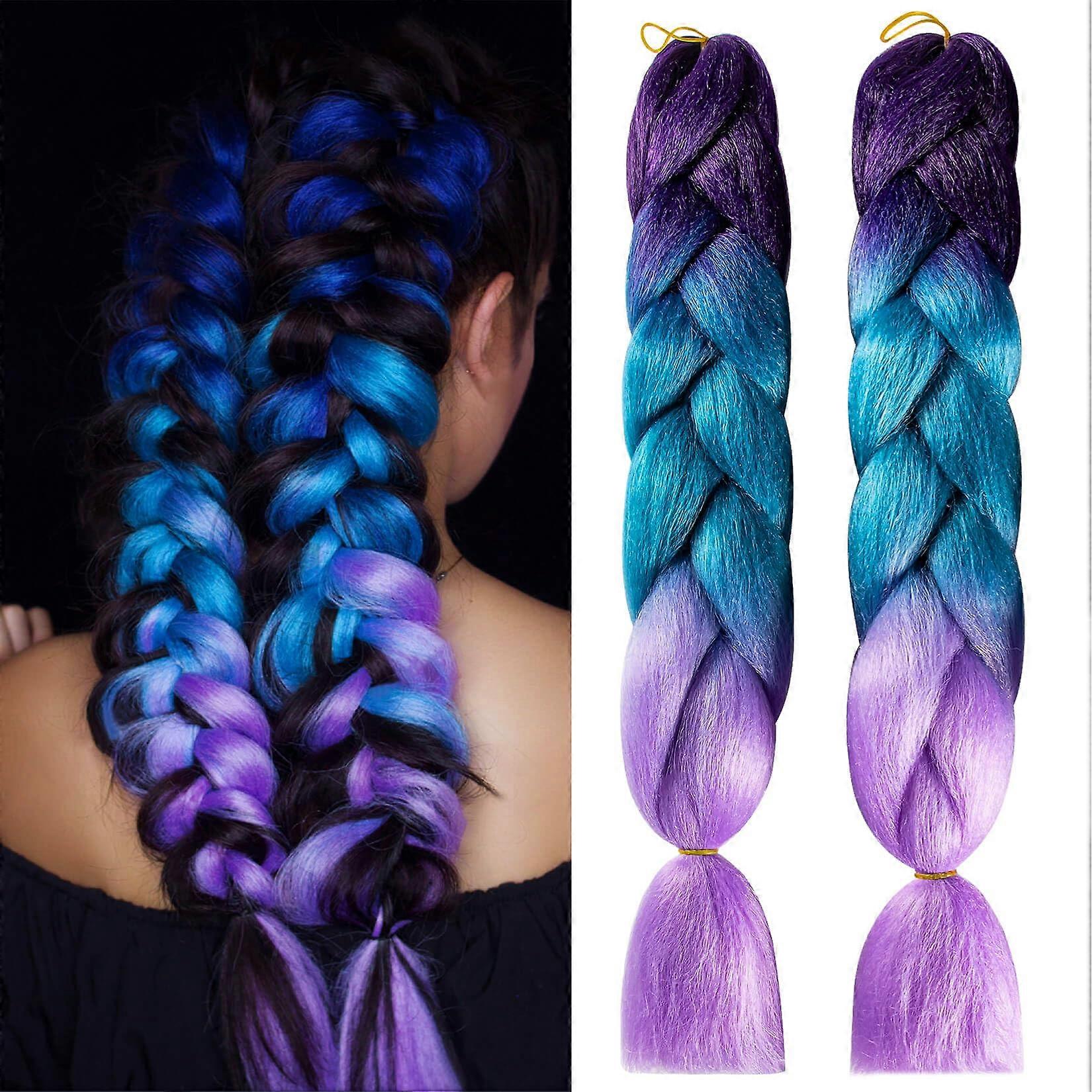temperature synthetic braided hair in purple, lake blue, and light purple. Crossbraided tricolor strands create a distinctive artistic look that enhances a wide range of protective and fashion styles. Key features and benefits Tricolor crossbraid: Purple, lake blue, and light purple woven together for a visually striking, dimensional finish that complements jumbo braids and colorful looks. Heatresistant synthetic fiber: Can withstand hot water styling to shape the ends into curls, allowing quick changes between straight and curly finishes. Smooth, soft, tangleresistant texture: Feels manageable during installation and everyday wear, reducing time spent detangling. Ready for multiple styles: Designed for jumbo braids, ponytails, cuboid braids, corn braids, box braids, and other creative braiding techniques. Clear sizing and quantity: Package includes 2 pieces, each 24 inches long, suitable for medium to longlength braid styles or for mixing with natural hair. Practical use scenarios Special events and celebrations: Add bold color for weddings, parties, and stage performances to create a memorable hairstyle that photographs well. Seasonal looks and holidays: Use for Halloween, Christmas, or themed events to achieve eyecatching, characterready hair. Everyday protective styling and travel: Wear as a protective option that changes your look while reducing daily styling time. Styling and care tips To add curls: Immerse the ends in hot boiling water briefly, then allow to set and cool for a curly finish. Installation: Compatible with common braiding techniques such as jumbo braids, box braids, corn braids, ponytails, and cuboid braids. Maintenance: Gently smooth with a widetooth comb or finger detangle to preserve the braided look and minimize frizz. Package contents Two 24 inch synthetic braided hair pieces in purple, lake blue, and light purple; temperature resistant, soft, and designed to resist tangling. This product offers an easy way to introduce vivid color, versatile styling options, and heatsettable performance for a range of everyday and special occasion looks.
