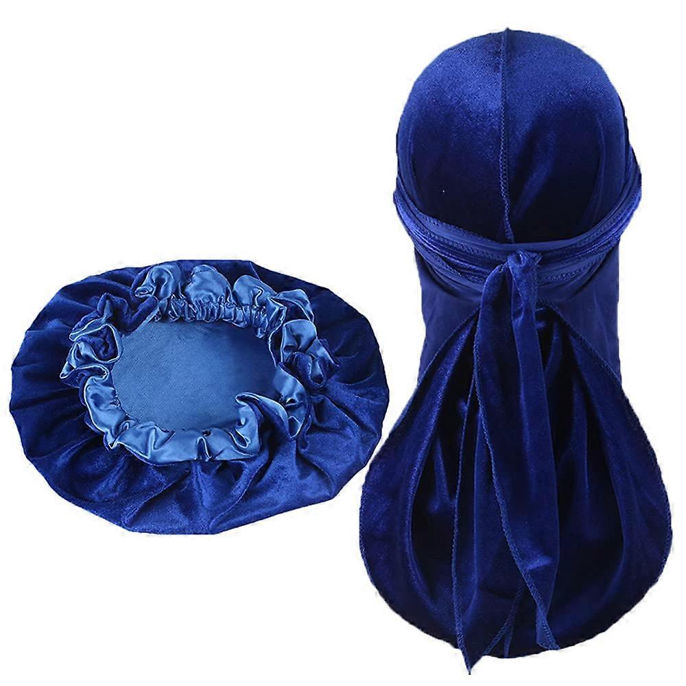 Velvet Durag and Satin Bonnet Set Blue, Long Tail Straps for Men Women Hair Protection