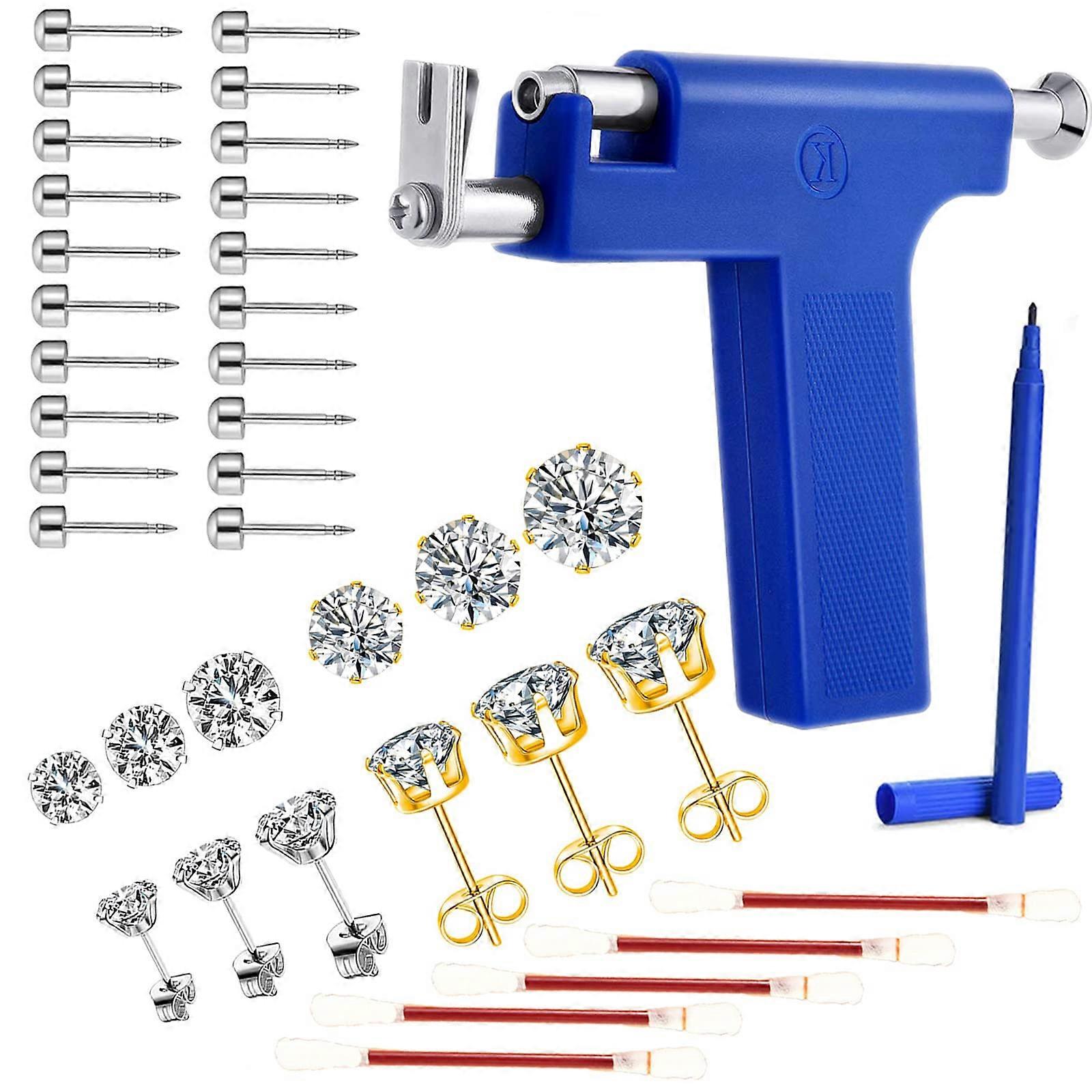 Color: Blue Professional ear piercing tool kit with sterilization sticks. A compact, stainless steel piercing instrument with a full set of studs and accessories for home or salon use. Key benefits Complete kit for immediate use: includes everything needed to perform piercings and basic aftercare in one set. Durable construction: piercing tool made from quality stainless steel for corrosion resistance and repeated use. Easy to operate: simple mechanism and compact size make the tool suitable for firsttime users and experienced piercers. Versatile: compatible with multiple piercing locations including earlobes, nostrils, belly button, and other body piercings that accept poststyle studs. Portable and organized: compact, travelfriendly kit with a mirror and marker pen for precise placement. What is included 1 piercing tool (blue) 2 styles of stud earrings in gold and silver 6 pairs of cubic zirconia stud earrings in assorted sizes 30 stainless steel earring studs 5 iodophor disinfectant sticks 1 round mirror 1 marker pen How the iodophor sticks work Each stick contains iodophor disinfectant. To activate, break the marked end of the stick. The iodophor liquid will flow into the swab tip for onsite disinfection. Useful attributes Material: quality stainless steel for the piercing instrument and stainless steel studs for durability. Size: compact, mini design for ease of handling and portability. Function: designed to push a poststyle stud through tissue and hold it securely for initial healing. Practical use scenarios Athome first piercings: perform earlobe piercings at home with a clear mirror and marker for correct placement. Salon or professional touchups: a compact tool for quick piercings of ears, nose, or belly button where poststyle studs are used. Travel or events: portable kit for onthego touchups or emergency replacement studs. Aftercare recommendations Clean the piercing site and studs with a disinfectant before and after piercing according to the iodophor stick instructions. Keep the studs in place for an initial period before changing to other jewelry to minimize disturbance of the piercing track. Avoid exposing the fresh piercing to water and dry the area gently after showering. Avoid tight pressure on the pierced area during sleep. If you have known metal sensitivities, use compatible materials such as plastic or sterling silver studs. Notes and cautions Intended for use with poststyle studs included in the kit. Follow the included instructions for the iodophor sticks to ensure proper activation and use. If you are unsure about performing a piercing yourself, consider consulting a professional piercer.