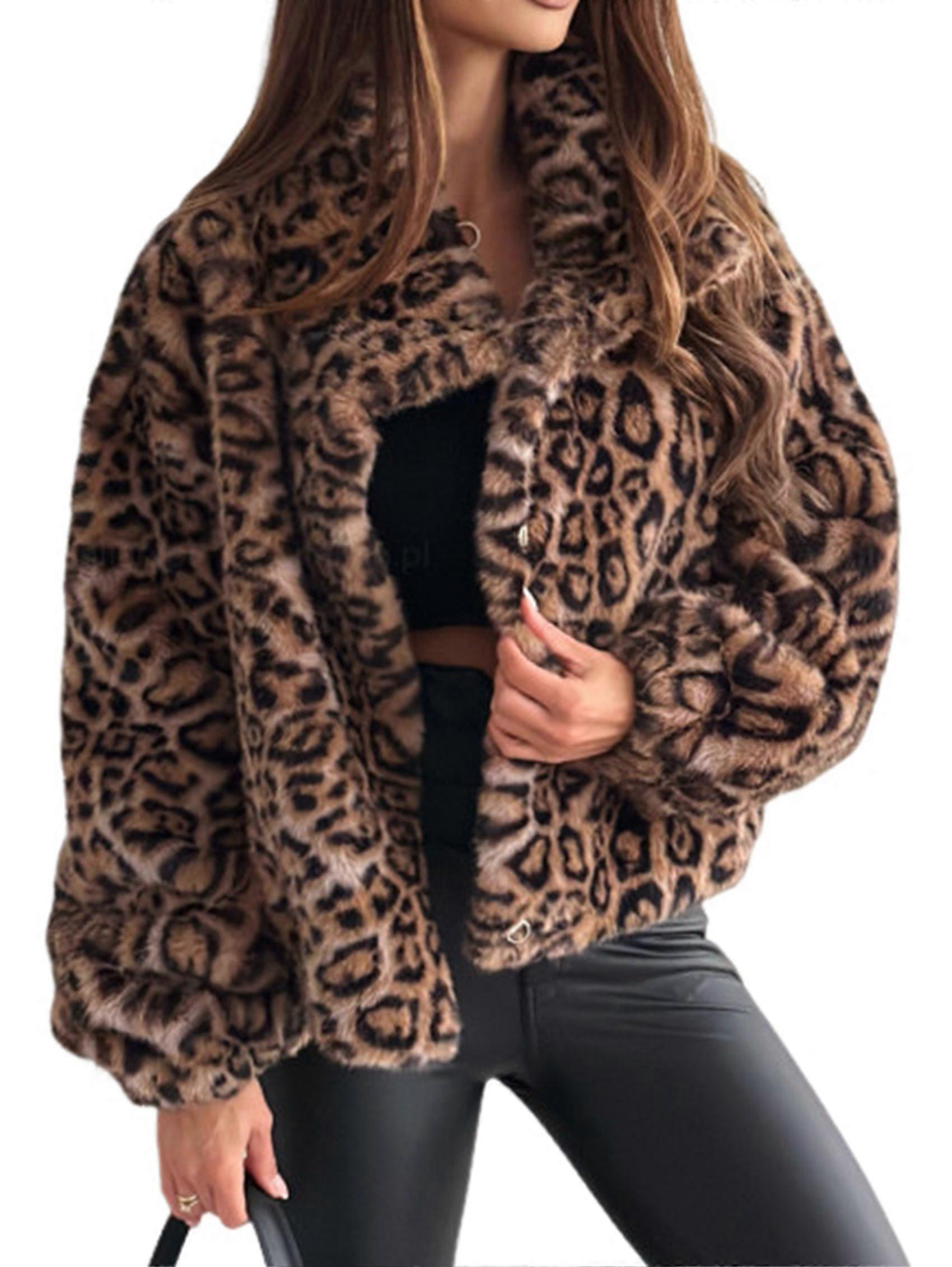 Female Faux Fur Long Coat Button Down Lapel Fleece Sherpa-Jacket Leopard Print XXL