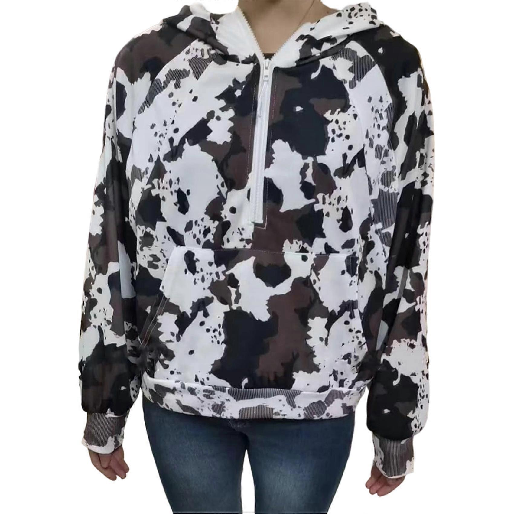 Y2k Quarter Zip Pullover Sweater Women Oversized Cute Hoodie Colorful Patchwork Cow Print Hoodies Dark Brown S