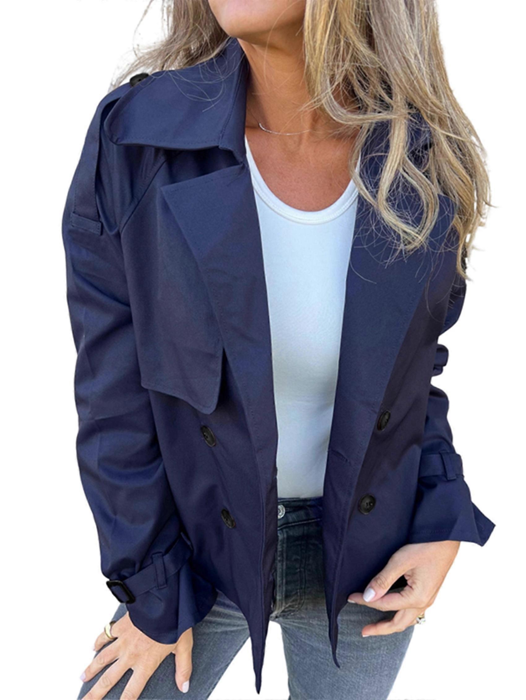 Female Trench Coat Casual Double Breasted Jacket Fall Fashion Outerwear Dark Blue XXL