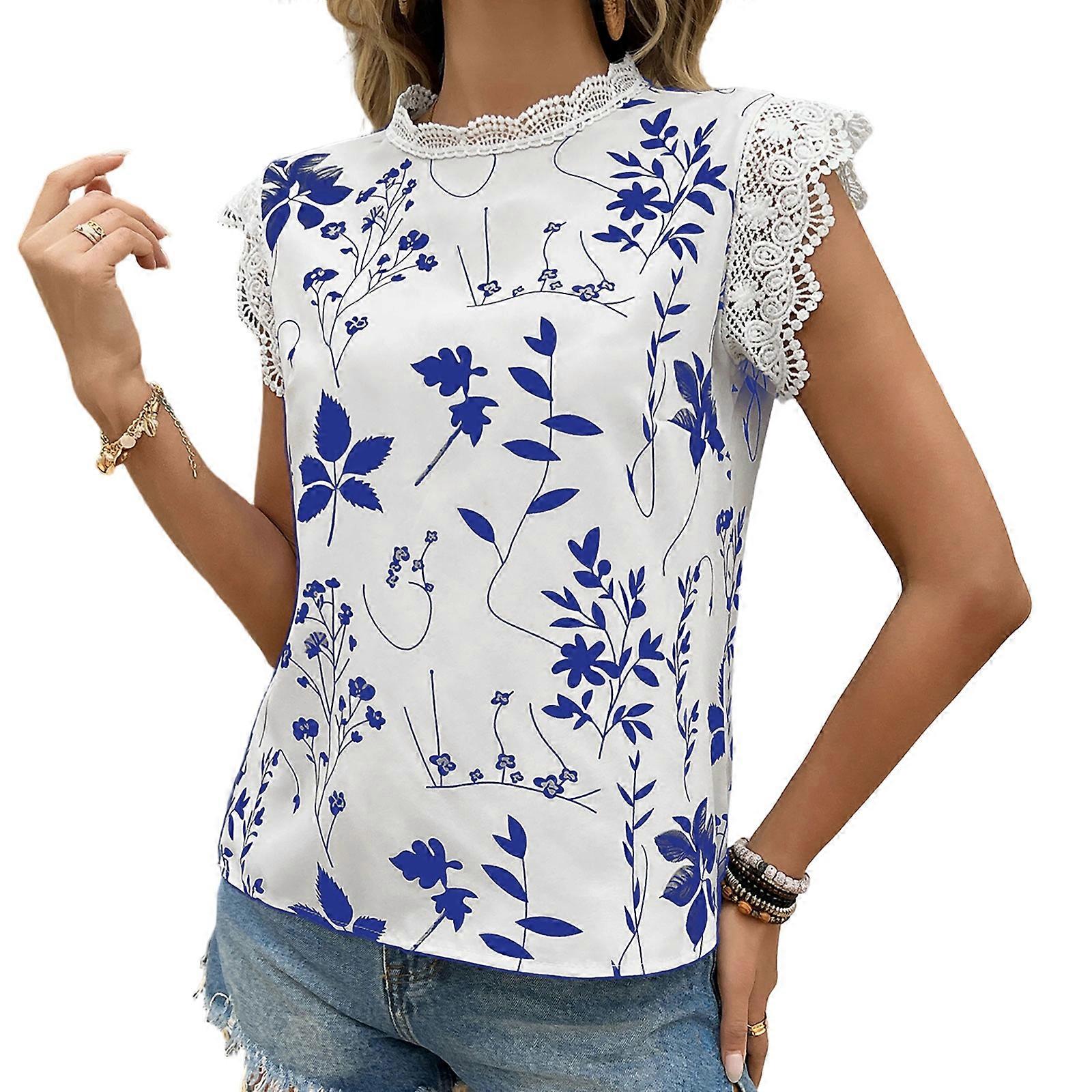 Women's Floral Print Lace Patchwork T Shirts Casual Boho Cap Sleeve Crewneck Blouses Tops white blue XL