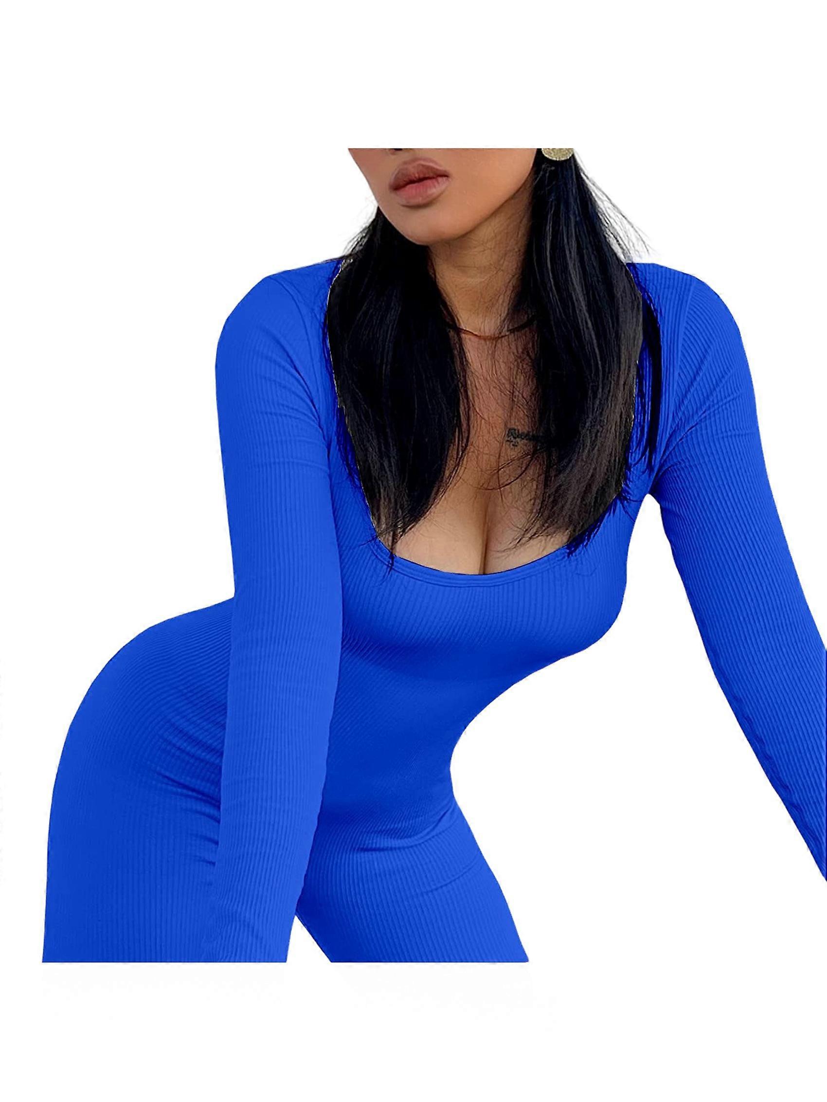 Women'S Workout Seamless Jumpsuit Yoga Ribbed One-Piece Long Sleeve Leggings Romper Blue M