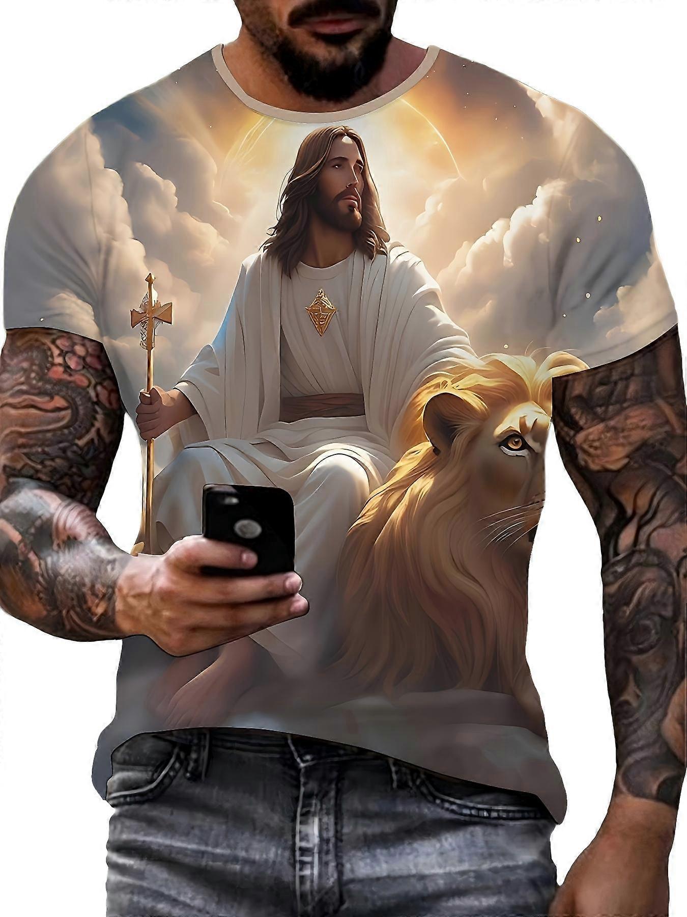 Men’s 3D Print Golden Tone Graphic T Shirt Figure And Lion Scene Print Casual Faith Tee