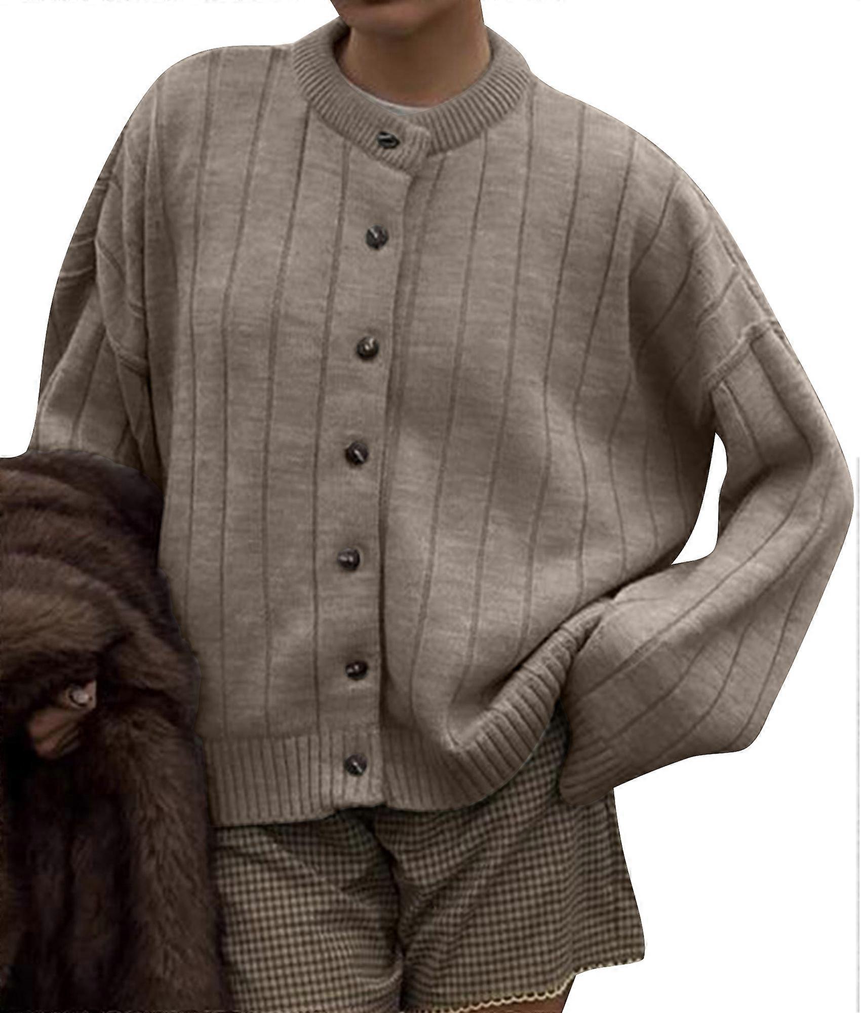 Womens Open Front Cardigan Sweaters Button Down Knit Long Sleeve Crewneck Casual Loose Fall Khaki S