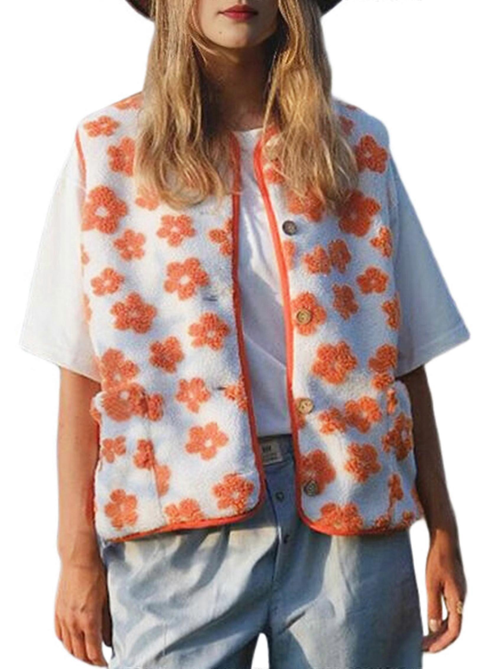 Womens Vest Casual Sleeveless Floral Prints Button Down Sherpa Jacket Outerwear with Pockets Orange S
