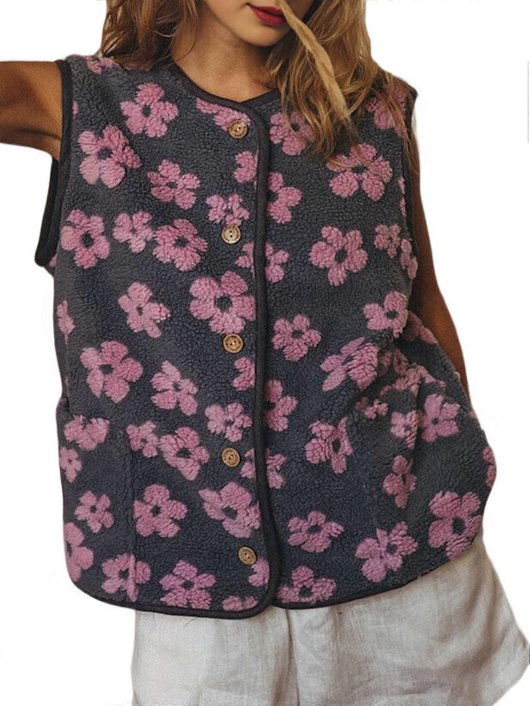 Womens Vest Casual Sleeveless Floral Prints Button Down Sherpa Jacket Outerwear with Pockets Pink M