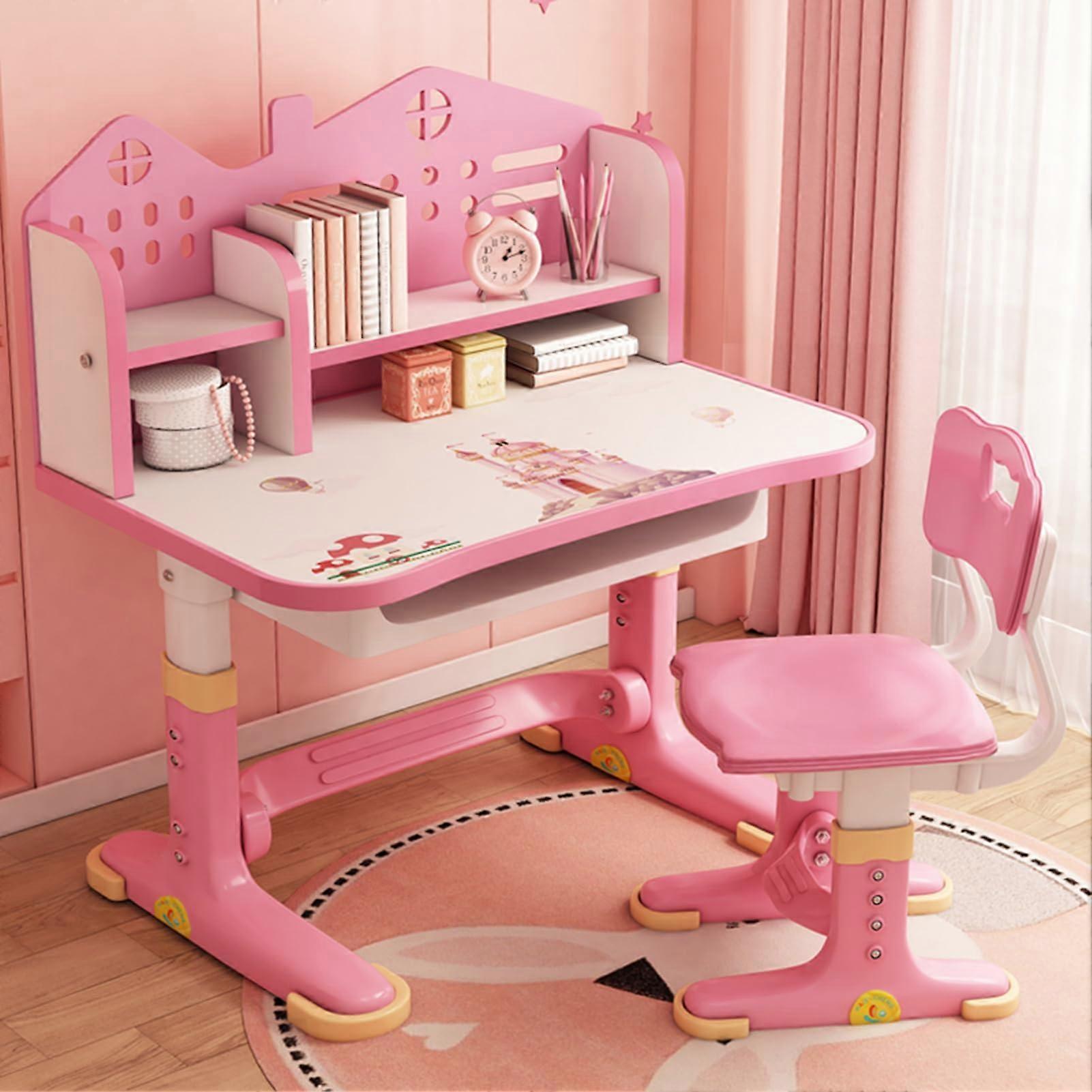 Kids Study Desk and Chair Set, Height Adjustable Ergonomic Table with Cartoon Pattern and Storage, Pink
