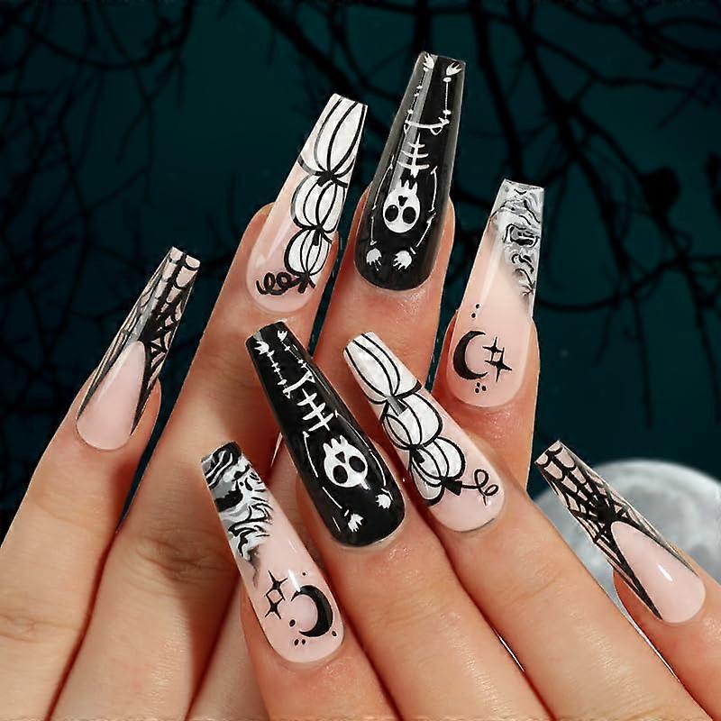 Halloween Press On Nails Long Coffin Black Fake Nails with Design Reusable Acrylic Set 24pcs
