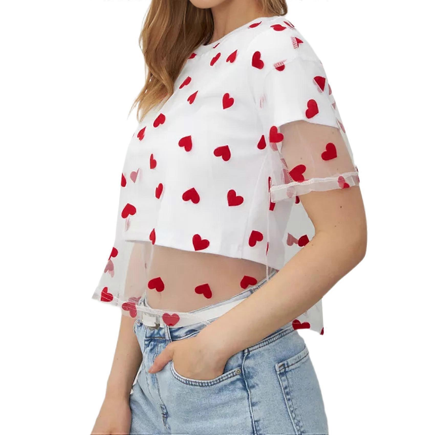 Mesh short sleeve tops for women are made of 100% Cotton, provides a breathable fit, which making it ideal for all-day wear. Short sleeve tops design with heart print, a crew neck. The top hugs your figure and accentuates your natural shape without being uncomfortably revealing. They're extremely versatile. Net top can be wear alone, also can be worn as layering with cami, dress, jacket and blazers, and with jeans, tight pants, shorts and leather skirts for a chicvibe. Whether you're heading out for a casual day of shopping, meeting friends for a coffee, or running errands around town, its trendy and relaxed style fits right in. It's also perfect for casual office environments, providing a comfortable yet professional look. Size: Colour: White Material: 100% Cotton Package Contents: 1 * T-Shirt Only the above package content, other products are not included. Note: Light reflection and different displays may cause the color of the item in the picture a little different from the real thing. The measurement allowed error is +/- 1-3cm.