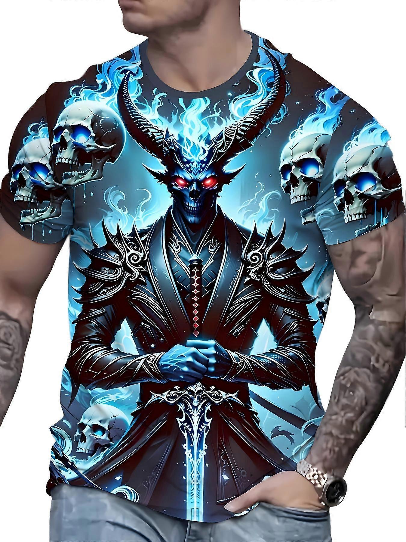 Men’s Edgy Graphic 3D T Shirt Blue Flame Demon Skull Print Casual Streetwear Tee