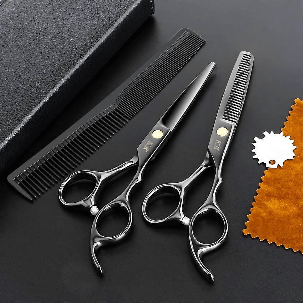 Precision hair cutting scissors made from 100% Japanese stainless steel for clean, even cuts and longlasting edge retention. Handfinished blades provide hardness and a clearly defined blade line for stable, lowfriction performance on both dry and wet hair. Key benefits Clean, precise cuts: Extremely sharp blades cut hair instantly to reduce split ends and uneven trims. Durable material: Japanese stainless steel construction and multiple handcrafted finishing steps deliver hardness and longterm edge stability. Smooth operation: Balanced design and lowfriction blade surfaces provide smooth opening and closing for controlled cutting. Comfortable to use: Ergonomic finger hole and curved finger rest reduce hand fatigue during extended use. Adjustable tension: Builtin adjustment screw lets you finetune blade tension for the preferred cutting feel. Versatile sizing: Overall length 6.9 inches with 3.8 inch blades suitable for a wide range of users and styles. Performance and compatibility Suitable for all hair types and textures, effective on both dry and wet hair. Designed for professional salon use, barbers, and grooming needs. Safe and easy to handle for men, women, seniors, and children. Practical use scenarios Salon layering and texturizing: Use the flat scissors for precise cutting and the tooth scissors for softening lines and creating texture. Home trimming and maintenance: Compact 6.9 inch length makes athome trims and touchups comfortable and accurate. Barbering and styling for all ages: Effective for standard haircuts, fringe trims, and blending work on clients of different ages and hair types. Package contents 1 black flat scissors 1 black tooth scissors 1 black twofold comb 1 adjustment screw 1 cleaning cloth 1 leather storage bag This set delivers professionalgrade blades, ergonomic handling, and essential accessories to keep your scissors performing and organized.